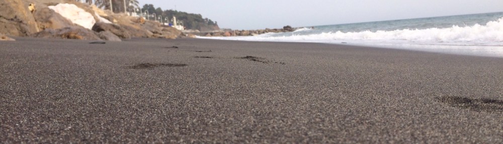 Am Strand – der Strand von Mezquitilla ist ein Gemisch aus Stein/Kies und sehr dunklem, fast schwarzem Sand: