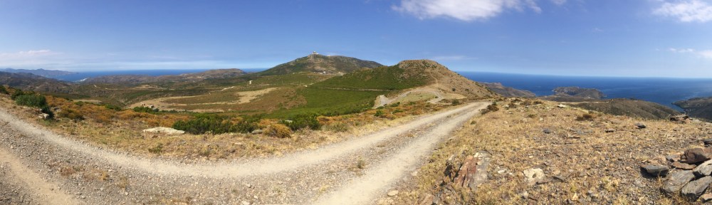 Nach dem Rundgang gehen wir Richtung Strand. Gleich gegenüber der Zitadelle ist die Haltestelle des Tren Roses Expres. Wir holen uns die Karten für die Excursión Puig Alt, eine 2-Stundenfahrt durch den Parque natural de Cap de creus. Nach der Fahrt entlang der Küstenstraße durch Roses geht es schließlich ins Naturschutzgebiet, hinauf zum Puig Alt auf ca. 490 m. Dabei begleitet uns der sich schon den ganzen Tag aufbauende Tramontana, ein kräftiger, böiger und recht kühler Fallwind. Bei unserer Fahrt sehen wir zahlreiche Buchten und Strände, blicken über Montjoi zum Cap Norfeu und nach Norden auf El Port de la Selva bevor es wieder auf die Abfahrt nach Roses zurück geht.