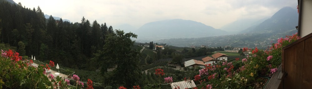Zurück auf der Winzerhöhe fallen wir schließlich nach einem Blick von unserem Balkon über Schenna und Meran müde in unsere Betten.