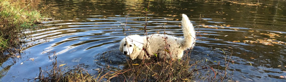 Erst sind wir auf der Straße lang in den Wald. Dort haben wir eine kleine Hundedame getroffen. Die hat erst geschnuppert und dann geknurrt. Da sind wir einfach weiter gegangen. Dann haben wir Leute mit einem riesengrosen Pyri getroffen. Der hat vielleicht ein Spektakel gemacht. Ich wollte eigentlich nur spielen, aber der hat grimmig gebellt und an seinem Menschen rumgezerrt. Da sind wir auch weitergegangen. Immer schön durch den bunten Laubwald. Das war herrlich. Meine kleine Menschenschwester hat mich geführt – außer bei dem großen Pyri, da hatte mein großer Mensch mal kurz übernommen – weil, ich war ja noch online, ist ja hier überall Leinenpflicht. Und dann waren wir wieder bei dem Rauschewasser, das fällt von oben einfach den Berg runter und läuft dann weiter. Ein Wehr, sagen meine Menschen und auf der anderen Seite vom Wasser ist ein Kraftwerk. Na, mehr Kraft als mein Papa Hadrien und der riesige Fin hat das bestimmt auch nicht. Steht ja den ganzen Tag nur rum. Und dann bin ich wieder in dem großen Wasser gewesen, dem mit dem komischen Namen, Botschau oder so. Häää? 😳 Hmm 😐, Tscho-pau, sagt mein großer Mensch. Von mir aus, kalt war das Wasser. Bin aber trotzdem immer wieder rein. Und das war schön. Bin sogar geofflinet worden! Haha, ein kleines Stück weiter konnte ich dann nochmal rein.