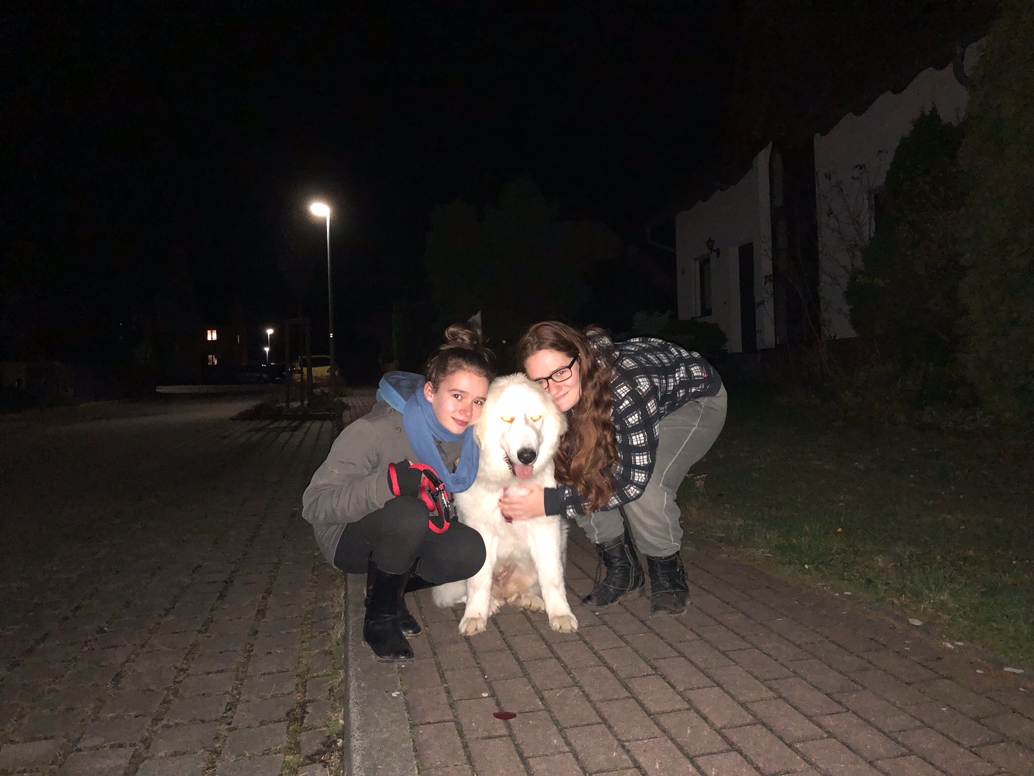 Als mein großer Mensch dann nach Hause gekommen ist, war es fastnochnichtganzdunkelfinster. Also noch ein bißchen hell. Und da war mein großer Mensch bei mir zum Knuddeln und Kuscheln. Und mein Menschenopa kam dann auch noch. Und dann gab es mein leckeres Abendfutter und danach habe ich mich ausgeruht bis meine Menschenschwestern gekommen sind und mich angezogen haben für unseren Abendspaziergang. Und dann kam noch mein großer Mensch und los ging’s! Meine kleine Menschenschwester hat mich wieder geführt. Mit meiner neuen, roten Leine. Ich hab alles in rot. Halsband, Ausgehgeschirr, Rolleine, Führleine, sogar mein Rindviehcherfutterfleisch ist rot. Jaaa, in echt! Alles rot. Weiiiiil, ich bin ein Mädchen! Eine Prinzessin und ’ne Pyri! Jawoll, so ist das. Da muß ich immer ganz schön folgen, bei meiner kleinen Menschenschwester. Aber trotzdem haben mich alle lieb. Weil ich Bella, die liebenswerte Pyriprinzessin bin 🐶😄👸🏼🐶. Und wir sind eine schöne große Runde durch mein Wohngebiet gelaufen, wir vier, meine Menschenschwestern, mein großer Mensch und ich! 🐶😳 häää, sind ja nur drei: Menschenschwestern, großer Mensch und ich 😳🤔🐶 Sind drei. Hmm 🤔. Aaaahhh! Große Menschenschwester, kleine Menschenschwester, großer Mensch und ich! Also doch vier! Sag ich ja 🐶😄🐶. Ich bin schlau! Pyri eben! Kann man nichts dagegen machen. Ist so. Pyris sind schlau. Jawoll! Und am Straßenrand habe ich wie immer ganz brav Sitz gemacht. Und bin auch ganz lieb bei Fuß gelaufen. Meistens. Wenn es nichts spannendes zu schnuffeln gab.