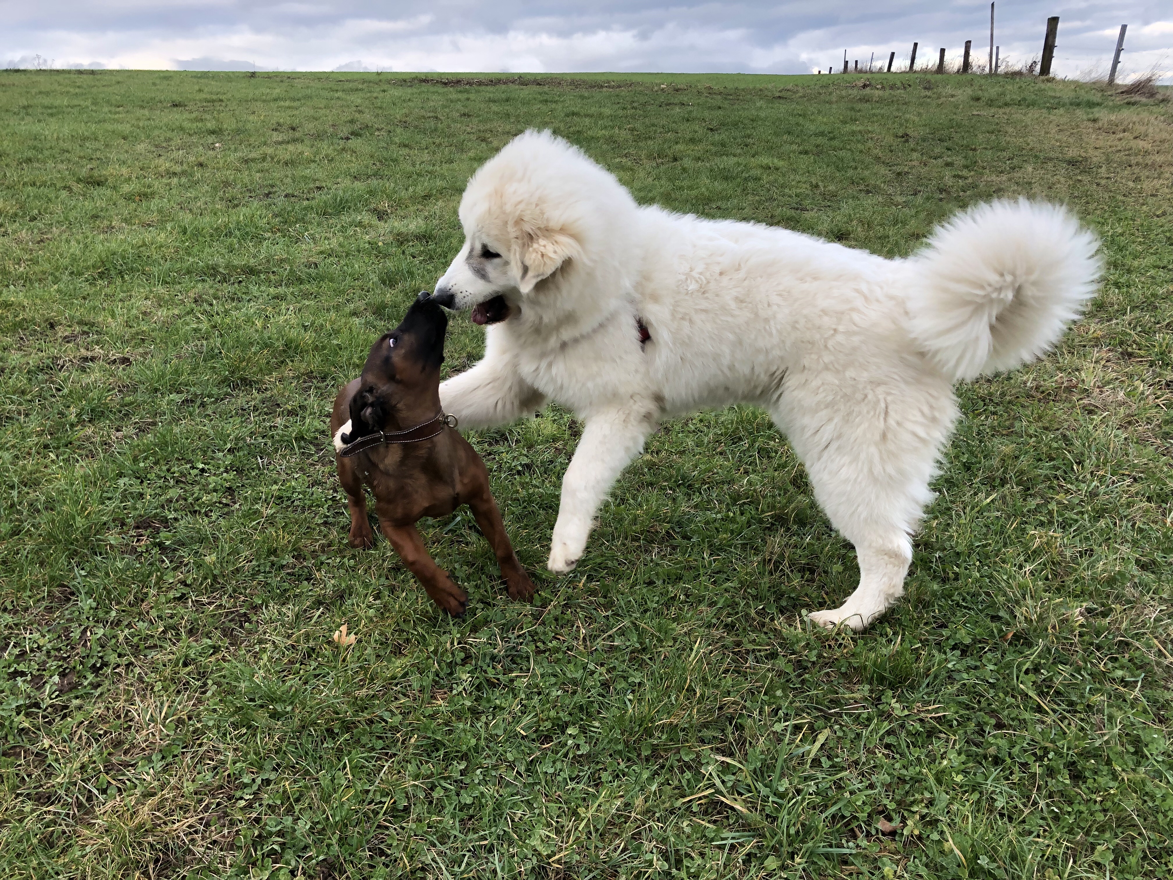 Nach der Mittagsruhe kamen dann schon wieder Wolken und meine kleine Menschenschwester und mein großer Mensch. Da bin ich wieder vermessen und gewiegt (🤪 Bäää, großer Mensch, ich sag immer noch gewiegt) worden. Ich bin einen Kilometer gewachsen … Hää? 🤔 Achso, Zentimeter, sagt mein Besserwisser, mein großer Mensch, na gut, von mir aus. Auf jeden Fall habe ich jetzt eine Schulterhöhe von 65 Metern und … Ooorrrrr … bäbäbäbäbäääää … 78 Z…ä…h…n…t…i…meter Brustumfang und wiege 30,5 Kilos! Jawoll! Mit dickem, fettem, kuschelig warmem Winterfell! Jawoll. Und dann sind wir zu meiner großen Feldwiese gegangen. Unterwegs haben wir noch meine Freundin Cora abgeholt. Weiiil, wir beide toben immer zusammen über meine große Feldwiese. Und das macht Spaß. Richtig Spaß. Die Cora ist nämlich ein Jagdhund und blitzschnell. Die rennt schneller als ich gucken kann. Eine Bayerische Gebirgsschweißhündin ist die Cora nämlich und die schweißt durch die Gegend, hohohohooo, kann ich da nur sagen. Blitzschnell, bliiiiiiitzschnell, jawoll! Wir necken und jagen uns dann immer auf der großen Feldwiese. Und schnappen nach unseren Nasen, Ohren, Nacken. Hihi 😂, das ist lustig. Dann mußten wir aber wieder nach Hause. Die Bella, also ich, war auch ruhebedürftig.