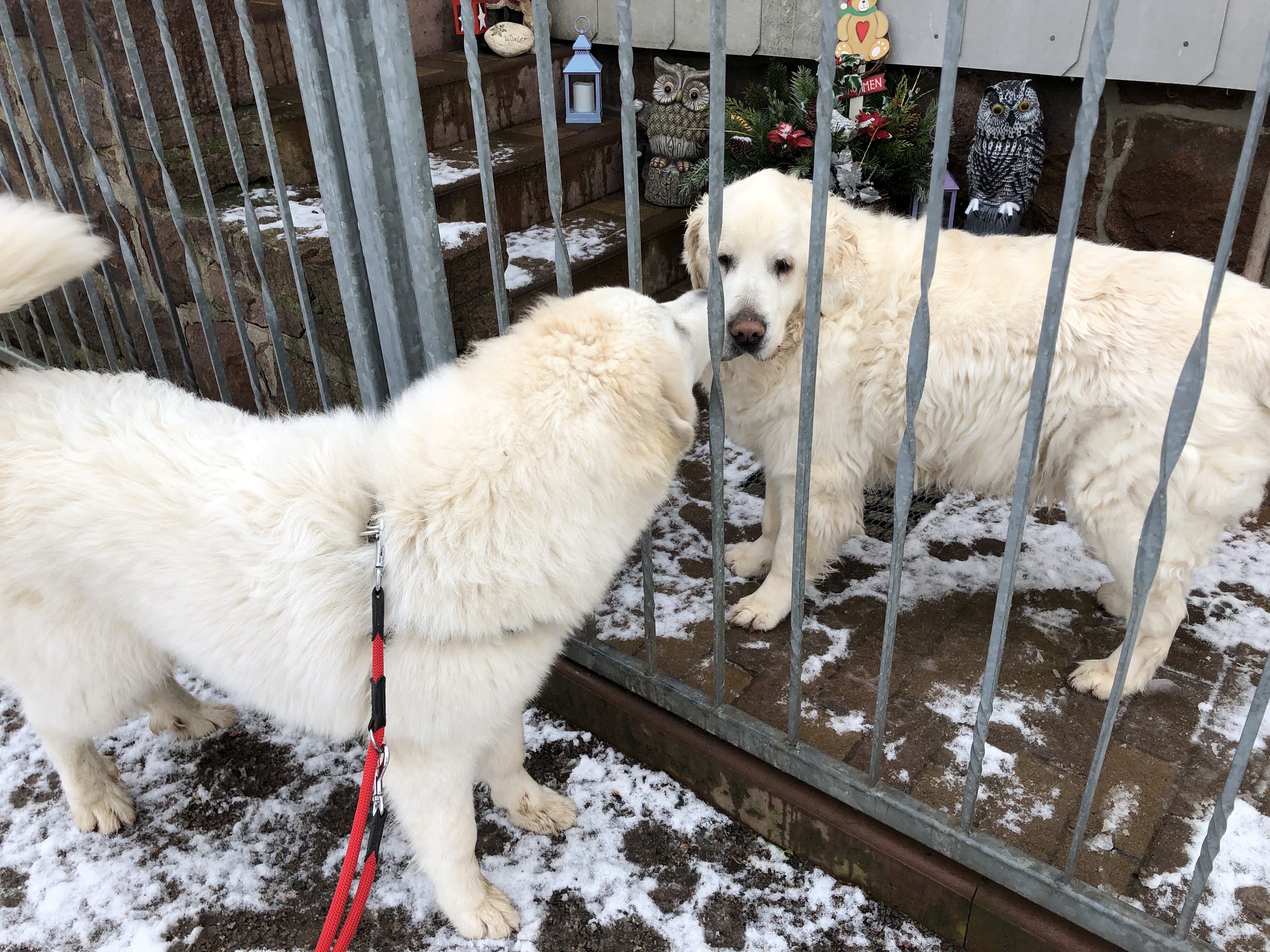So, jetzt hat die Bella ausgeschlafen. Bella hat heute nämlich ganzganzganz lange geschlafen. Weiiil, ich war ja gestern bei der Hundeweihnachtsfeier. Mit meiner Sissi-Schwester und meiner Ivi-Mami und meinem riesigen Fin und ganzganz vielen anderen Pyris und Menschen und Hunden zusammen und das war sooooo schön. Und da bin ich erst ganzganz spät in meine Villa „Idefix“ zum Schlafen. Und da habe ich heute mal länger geschlafen. Mein Menschenopa hat mich dann begrüßt und kurz danach kam auch mein großer Mensch. Da hat es schon geschneet. Aber kein schöner Knisterschnee, sondern Matschepampeschnee.