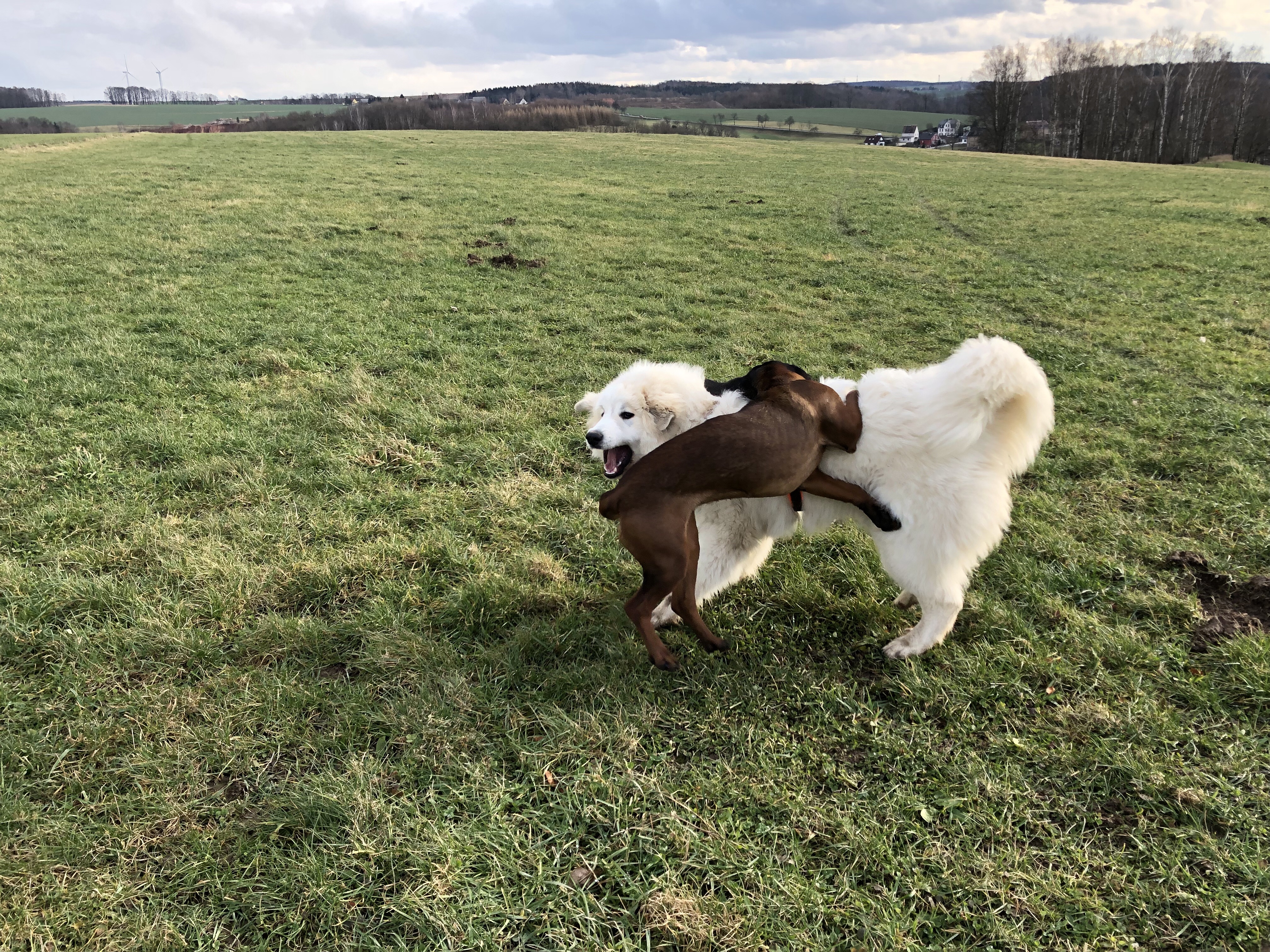 Nachmittags haben wir meine Bayerische Gebirgsschweißfreundin, die Cora, abgeholt und sind zum Toben auf die große Feldwiese gegangen. Hohohooo, da sind wir wieder rumgeschweißt. Ganz lange haben wir uns gejagt und gebisse; und habe uns im Dreck gerollt und nacheinander geschnappt. Hohohooo, das war schön. Ich sah wieder aus wie ’ne Sau 🐶😂🐶. Auf dem Rückweg sind wir nochmal bei Charlie, dem Goldigen Retriever, vorbei. Der war aber nicht draußen. Zu Hause habe ich mich dann bis zum Abendfutter ausgeruht. Nur zwischendurch immer mal jemanden angeschimpft. Muß ja auf meinen Garten aufpassen.