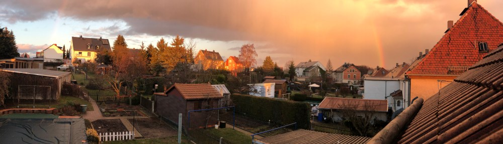 Ich habe zu Hause dann wieder meinen Garten bewacht. Und dann kam ein heftiger Regen. Und meine Sonne war da und der Mond und der blaue Himmel und die grauen Wolken und ein Regenbogen. Alle sind sie heute dagewesen. Bei mir! In meinem Garten! Dann hat mir mein großer Mensch mein Abendfutter gebracht. Hmmmmm, das war ganz lecker.