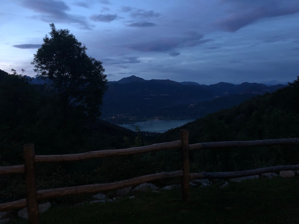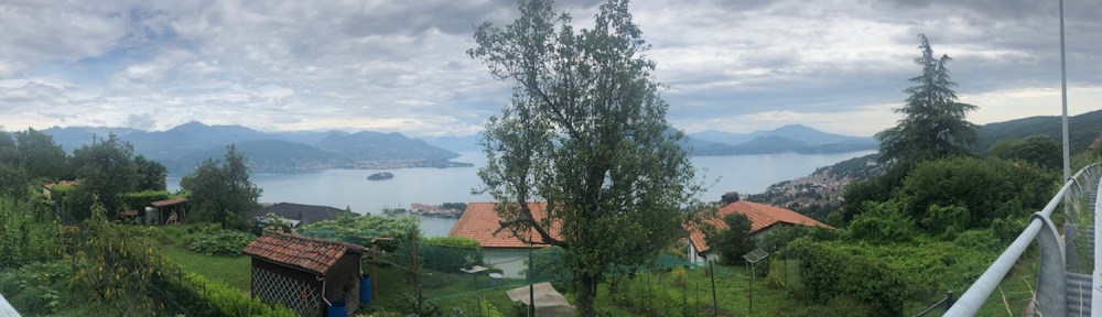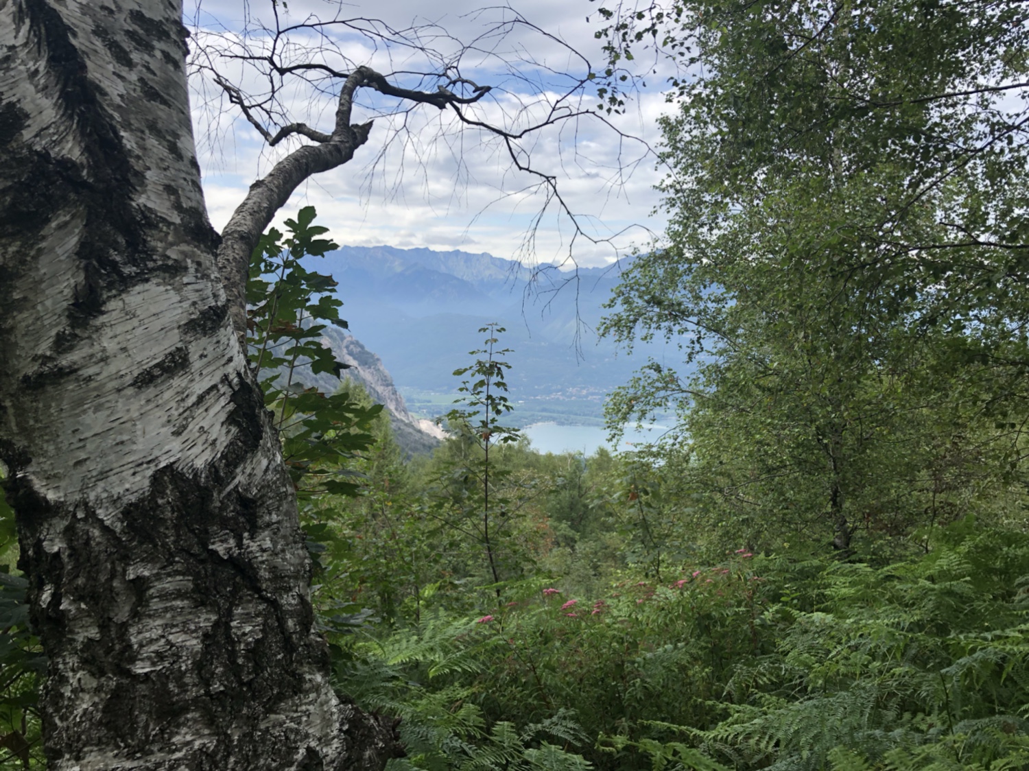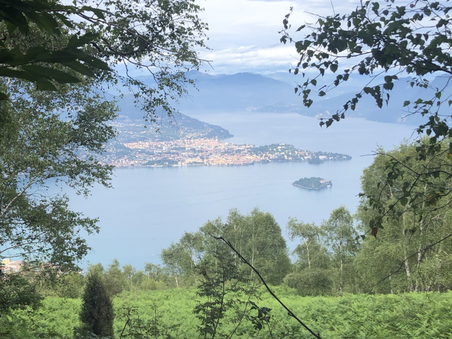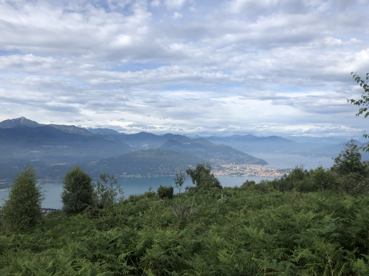 Wir starten dann noch auf zu einer kleinen Wanderung mit Bella. Unser Ziel ist ein Panoramaaussichtspunkt. Unterwegs haben wir schon einen schönen Blick auf die Berggipfel in der Umgebung. Die Sicht ist heute sehr gut. Alles schön klar. Unterwegs verlieren wir kurz die Orientierung, da der Weg in unserer Richtung plötzlich abbricht. Zum Glück haben wir Bella mit. Durch hohe Farne ist der Weg weitgehen zugewachsen. Unsere Pyri führt uns aber zielstrebig bergauf durch das dichte Grün. Oben haben wir dann einen herrlichen Panoramablick auf die Berge, den See und Verbania am gegenüberliegenden Seeufer. Ca. 200 m weiter durch meterhohen Farn gelangen wir an den eigentlichen Panoramaaussichtspunkt. Leider sind hier die Bäume inzwischen so hoch und dicht, daß von Panorama keine Rede mehr sein kann. Vom See sieht man praktisch gar nichts.