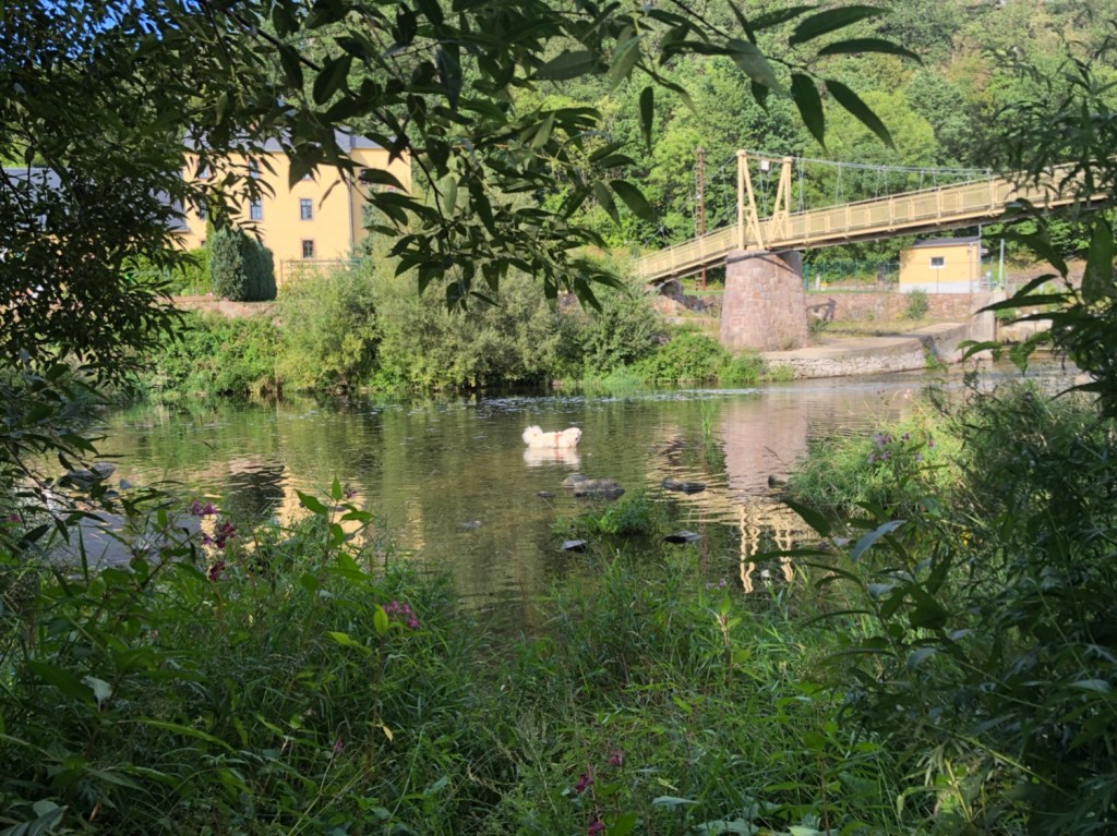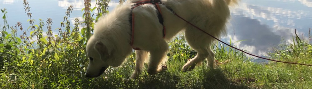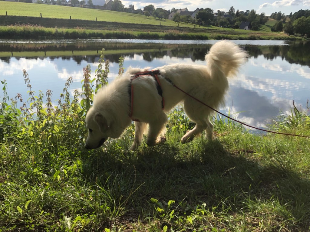 Einen ganz großen Spaziergang haben wir gemacht. Zuerst sind wir zum Feldweg an meiner großen Feldwiese gegangen und dort immer weiter bis zur Wackelbrücke. Ich bin gleich baden gegangen. Ganz weit rein. Und nach dem Baden sind wir über die Wackelbrücke auf die andere Seite vom großen Fluß mit dem komischen Namen gegangen und dann immer an der Tschooo-Pauuu lang. Bis zu der großen Brücke, die nicht wackelt. Und da bin ich mit meinem großen Mensch drüber. Von da aus sind wir dann nochmal an der Tschooo-Pauuu baden gewesen. An der großen Wiese. Da wo meine Badestelle ist. Und dann ging es auf dem Wanderweg durch den ganzen Wald und die Treppen hoch durch den Stadtpark. Mein großer Mensch sagt, ich war ganz lieb.