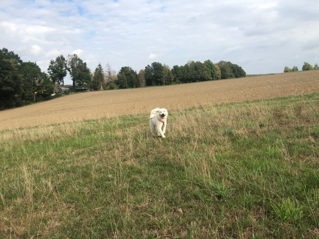 Wir sind dann über die ganze Wiese gelaufen und zurück zur Straße und weiter zur Frau Dobermann. Die hat natürlich wieder eine Ansprache gehalten. Aber wir sind weiter gegangen. Und beim Parkplatz sind wir über die große Wiese geschlendert zum kleinen Wäldchen und dann zu meinem Bächlein. Da habe ich getrunken. Evian! Weiiil, ich bin eine Französianerin! Eine Herdenschutzhündin bin ich, eine Pyri! Jawoll! Dann sind wir weiter durch den Wald zu meiner Freundin, der schwarzen Schäferhündin. Die hat mich begrüßt und dann haben wir uns durch das Gartentor angeschnuffelt. Danach bin ich mit meinem großen Mensch nach Hause gegangen.