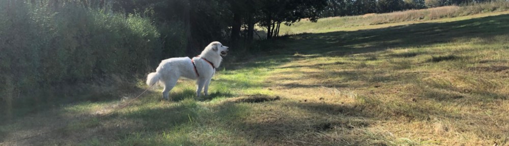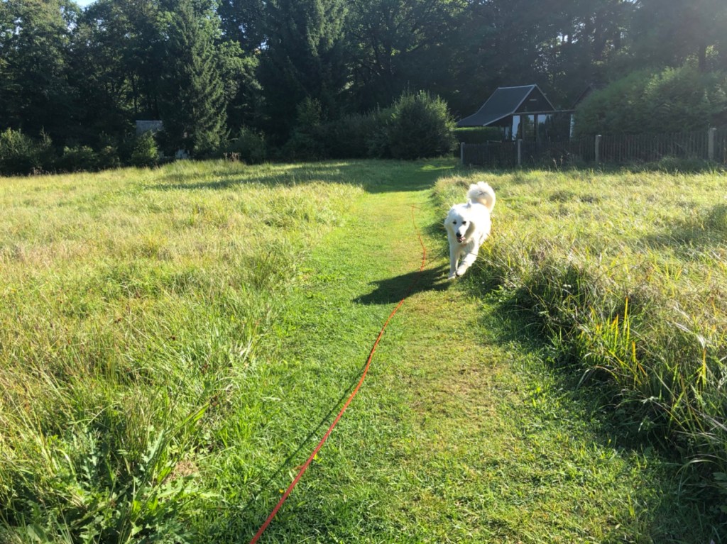 Wir sind dann zum kleinen Bächlein gegangen und ich habe getrunken. Dann sind wir über die Wiese in den Wald und dort immer weiter. Da, wo es zu dem „Waldhaus“ geht. Da war ich schon. Aber vorher sind wir abgebogen und einen Berg hoch und raus aus dem Wald. Und da waren wir dann auf einer Wiese. Mit ganz hohem Gras. Ooooo, das war schön! Da konnte ich durch das ganze hohe Gras hüpfen. Ich mag doch das hohe Gras so sehr. Da will ich wieder mal hin. Wir sind dann am Waldrand über die ganze Wiese gelaufen. Und ich konnte schnuffeln und hüpfen!
