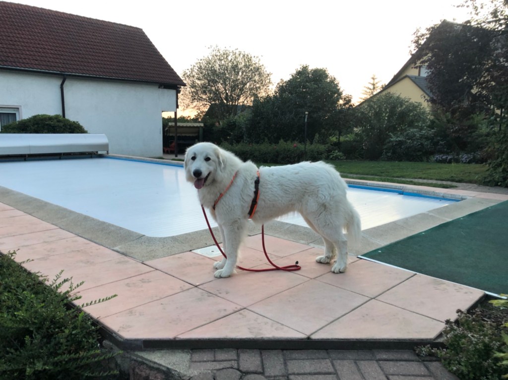 Dann habe ich auf meinen großen Mensch gewartet. Aber der hat wieder gebummelt. Da habe ich gerufen. Und da ist er dann gleich zu mir gekommen. Weiiil, ich bin doch seine Bella. Ich bin ganz lieb. Mein großer Mensch hat mir mein Geschirr angezogen und dann sind wir losgewandert.