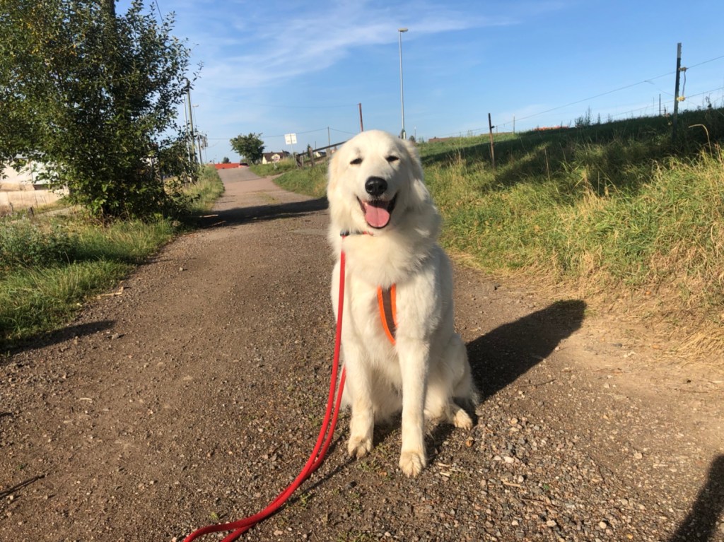 Wir sind zu meiner großen Feldwiese gegangen und auf den Feldweg. Und da sind wir an den Rindviehchern vorbei. Die lagen einfach so da. Auf dem großen Feld. Wir sind dann immer weiter am Feldrand gelaufen. Um das ganze Feld rundherum. Bis wieder ein Feldweg kam und den sind wir dann bis zur Wiese am Waldrand gelaufen. Über die Wiese sind wir dann zur großen Wiese an meiner Feldwiese gegangen. Und da habe ich erstmal eine Pause gemacht. Ich habe mich einfach ganz brav hingesetzt. Da weiß mein großer Mensch, Pause! Und dann habe ich nochmal gefrühstücksfuttert. Trockenfutter. Das hat mein großer Mensch immer mit. Wir haben ein Picknick gemacht, mein großer Mensch und ich, die Bella. Danach sind wir auf dem Feldweg zur großen Wasserschüssel gegangen. Da habe ich wieder Wasser von den Rindviehchern getrunken. Dann sind wir nach Hause gegangen und ich habe mich ausgeruht und Pyriprinzessinnenschönheitsschlaf gemacht.
