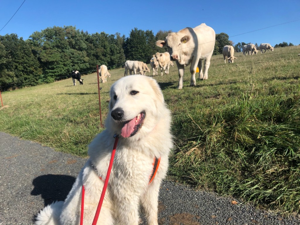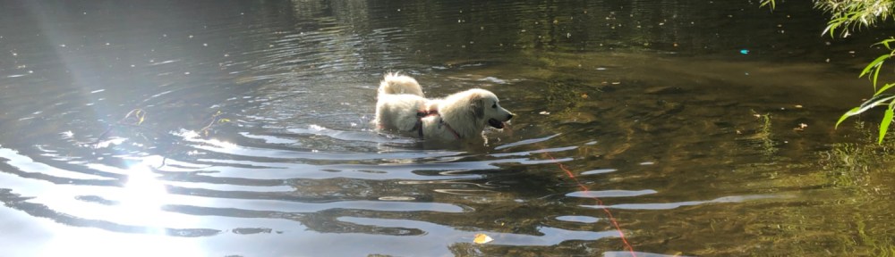 Dann habe ich gewartet. Auf meinen Sonntagsspaziergang. Mein großer Mensch kam dann auch gleich und hat mich angezogen. Und dann sind wir losgelaufen. Zum großen Feldweg und weiter nach Kockisch. Dort habe ich Kalle getroffen. Der mag mich. Aber ich mußte ja weiter sonntagsspazierengehen. Wir sind dann an die Wackelbrücke gelaufen und da drüber. Über der Wackelbrücke sind wir nach links abgebogen und dann durch den Wald. Heute haben wir gar niemanden getroffen, weiiil, wir sind heute schon fast eine Stunde eher losgewandert als sonst. Und ein ganzganzganz uraltes pyrenäenberghündisches Sprichwort sagt: „Morgenstund‘ is‘ gut für‘n Hund!“ Die Bella kennt sich aus mit sowas.