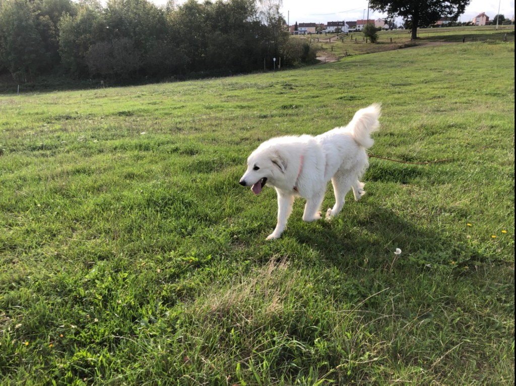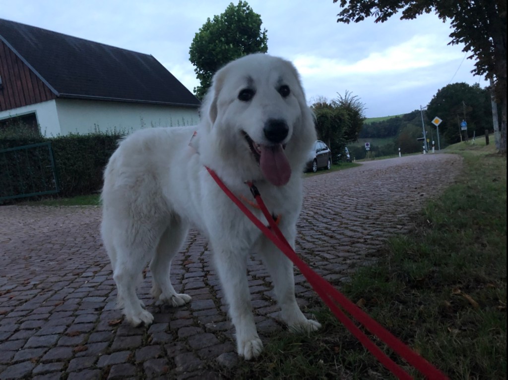 Nachmittags ist dann mein großer Mensch nach Hause gekommen und der war auch gleich bei mir zum Kuscheln. Und dann habe ich mein Geschirr bekommen und wir sind spazieren gegangen. Zu meiner großen Feldwiese. Und da konnte ich drüberflitzen! Dann waren wir noch bei den Rindviehchern auf der großen steilen Wiese. Da gab es ganzganz viele frische Kuhhaufen. Aber ich durfte nicht schleckern. Nur schnuffeln. Kuhfladen darf die Bella nicht futtern. Würde ich aber gerne.