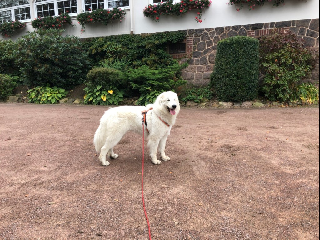 Im Wald geht es dann den Berg hoch bis auf den Wanderweg. Dort sind wir bis zum „Waldhaus“ gewandert. Unterwegs haben wir einen Menschen getroffen. Den kannte mein großer Mensch und schon ging das Gelaber los. Ich war ganz lieb und habe geschnuffelt. Aber dann sind wir weiter. Beim „Waldhaus“ Haben wir auf den großen Fluß mit dem komischen Namen geguckt und dann bin ich an die Tür vom Haus, weiiil, da war ein Geräusch. Und, gugge, da kam eine Hündin raus. Die hat mich begrüß. Dann haben wir uns beschnuffelt.Ganz lieb sind wir beide gewesen. Ganz lieb.