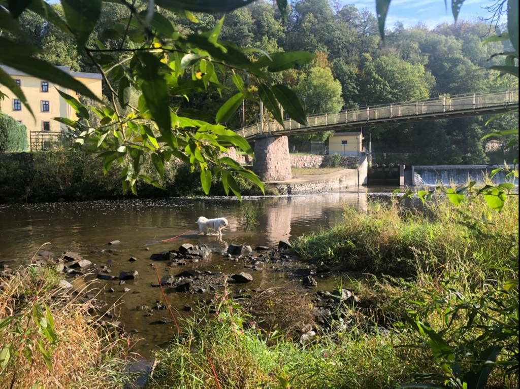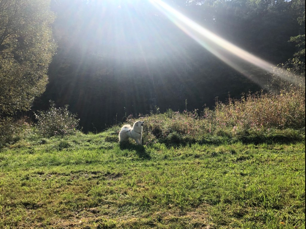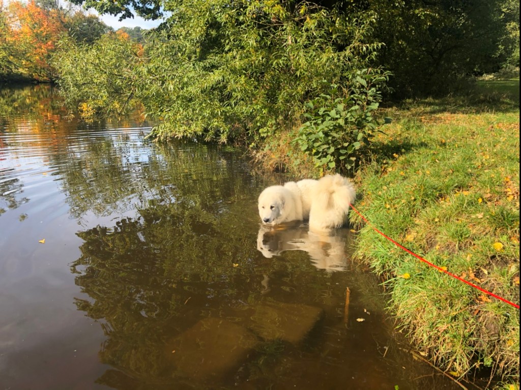 Mein großer Mensch wollte gleich über die große Wiese gehen aber ich wollte nochmal im Fluß mit dem komischen Namen baden gehen. Und so sind wir über die Wiese zur Badestelle und ich war nochmal im Wasser. Dansch sind wir über die große Wiese den steilen Berg hoch. In der Mitte habe ich gefrühstücksfuttert. Den ganzen Futterbeutel habe ich leergefuttert. Mein Pyribäuchlein war ja wieder leer. Danach sind wir nach Hause gegangen.