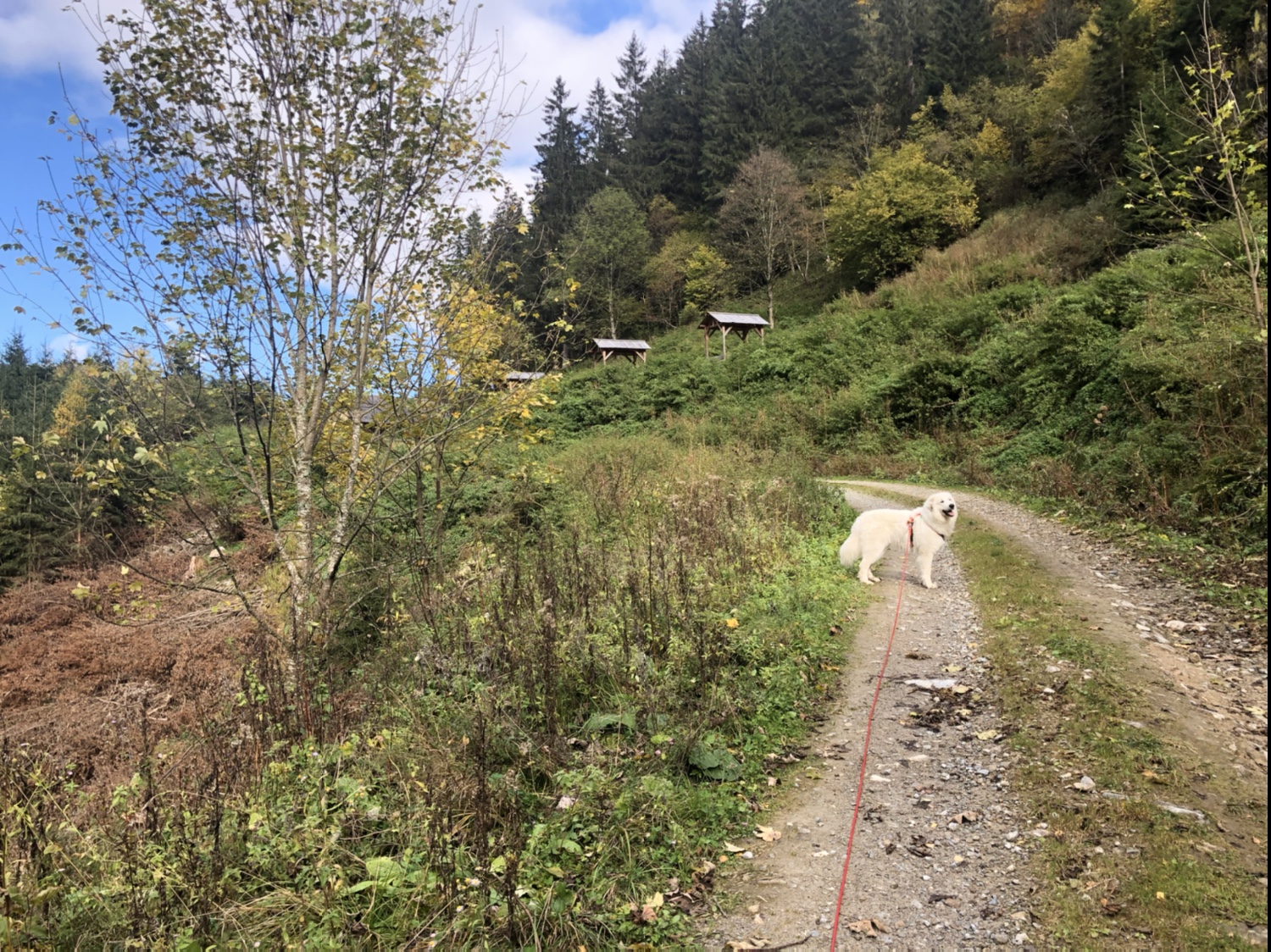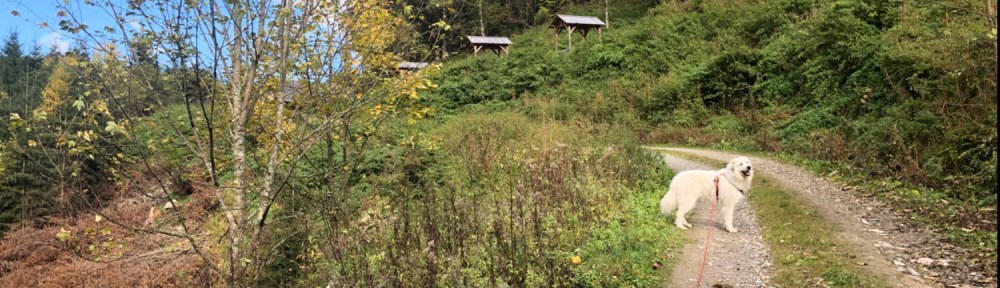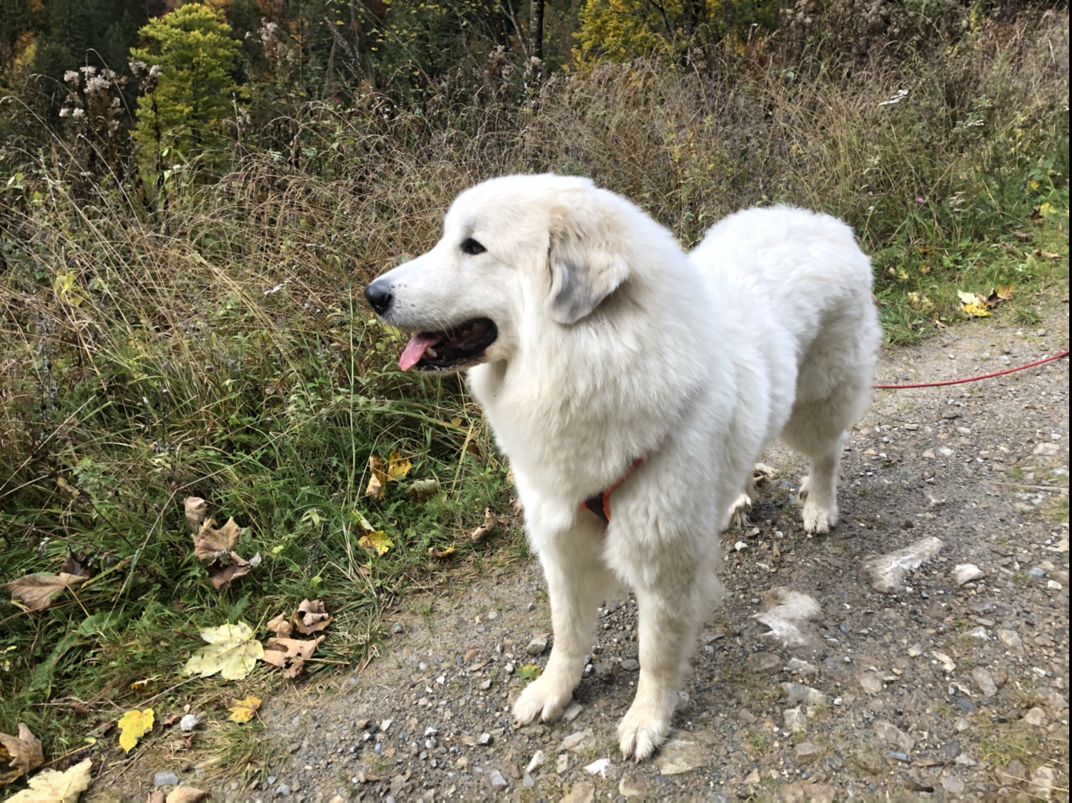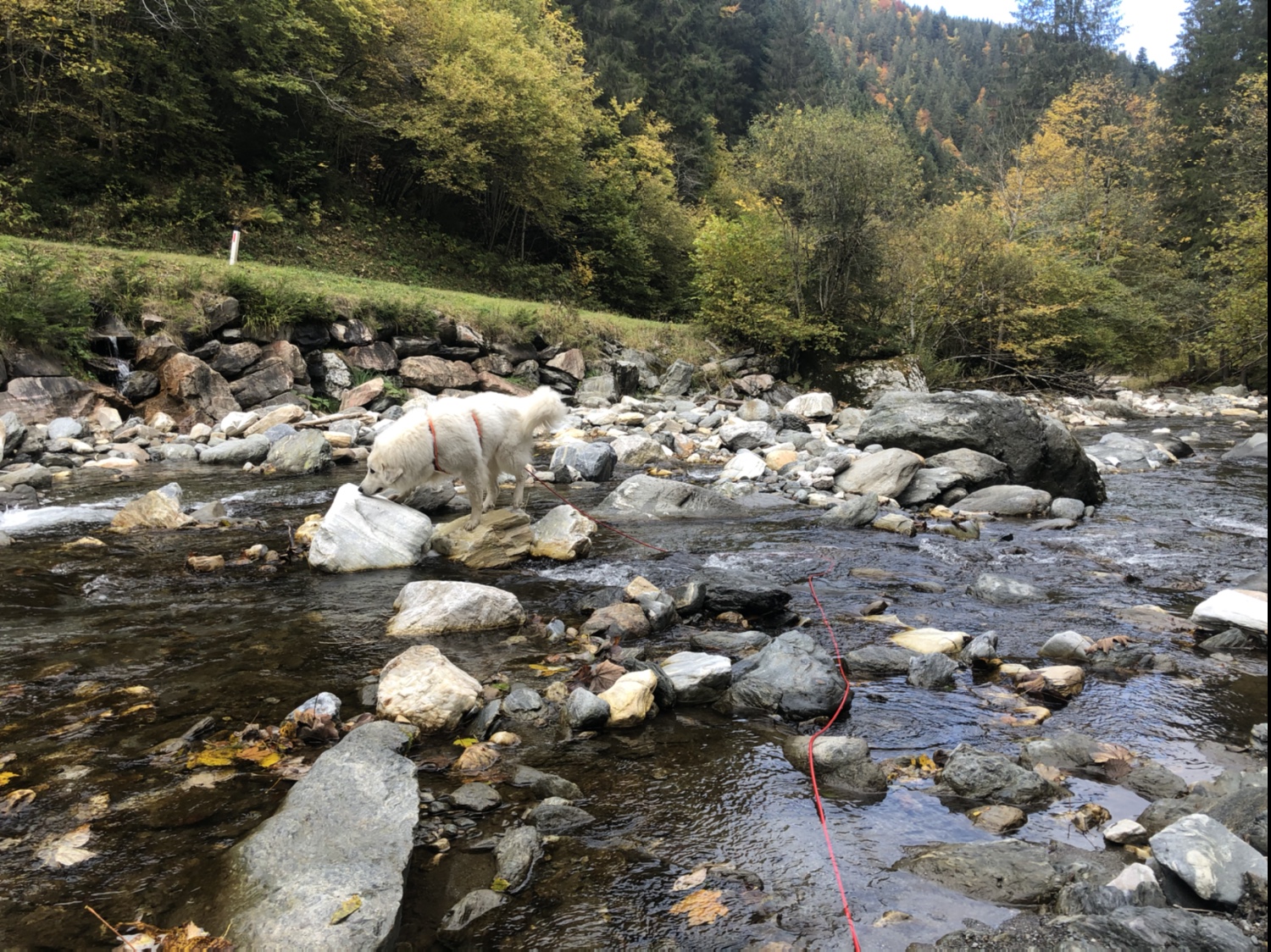 Am Donnersbach bin ich dann mit meinem großen Mensch spazieren gegangen. Ich habe geführt und meinem großen Mensch die schöne Gegend gezeigt. Ich bin eine gute Wanderführerin. Wir sind erst den Berg hoch und dann wieder runter zurück gewandert. Die Mädchen haben inzwischen im Donnersbach Granaten gesucht. Das sind Steine in Steinen. Und das ist komisch, das versteht die Bella nicht. Wir sind dann alle zusammen nochmal zum Bach gegangen. Ich bin da im Wasser gewesen. Das war ganz kalt und ganz klar.
