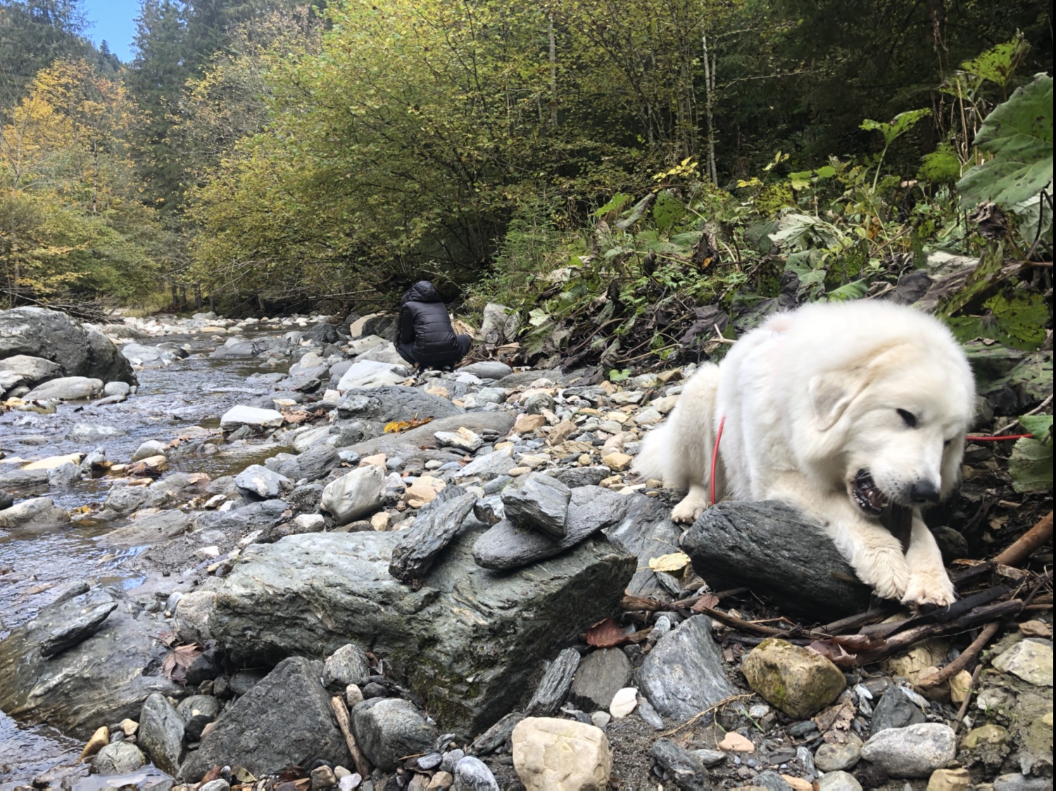 In Donnersbach müssen wir dann doch etwas suchen. Vieles hat sich geändert in den vergangenen 6 Jahren und wir sind ja auch nur dieses eine Mal hier gewesen. Wir fahren schließlich auf der B75 am Donnersbach entlang und biegen dann in eine Forststraßenzufahrt ein. Hier Stelken wir das Auto am Rand ab. Ich gehe erstmal mit Belka ein Stück spazieren bevor wir dann nochmal alle zusammen am Donnersbach Steine suchen.