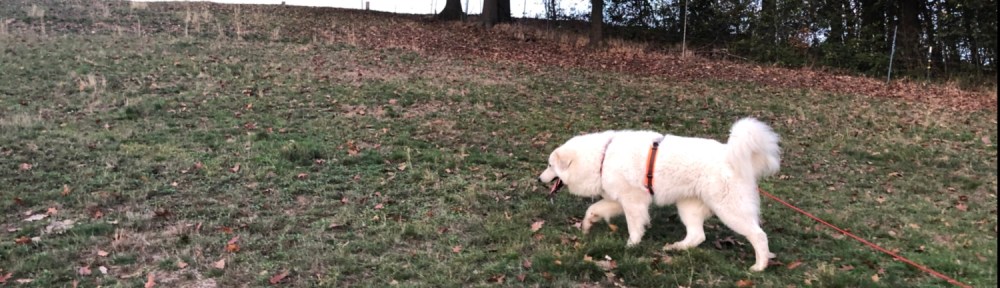 Mein großer Mensch ist erst später nach Hause gekommen. Da habe ich gleich mein Abendfutter bekommen und mich danach ausgeruht. Dann sind wir spazieren gegangen. Auf meine große Feldwiese. Ich bin wieder gerannt. Da mußte mein großer Mensch mitrennen. Weiiil, der war am anderen Ende von meiner schönen, langen, roten Feldleine festgemacht. Ich kann ganz schnell rennen! Mein großer Mensch nicht. Darum habe ich langsam gemacht.