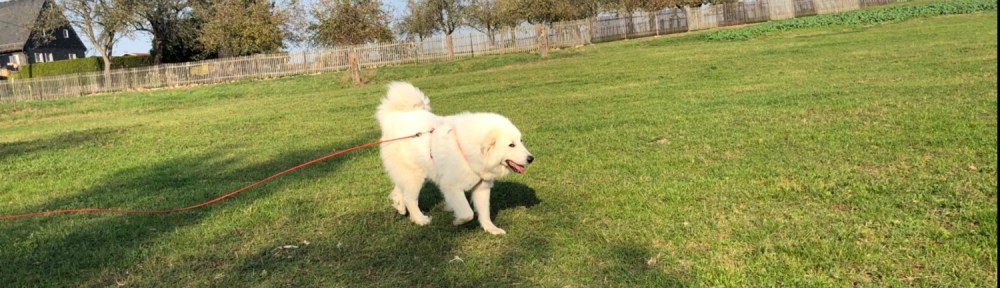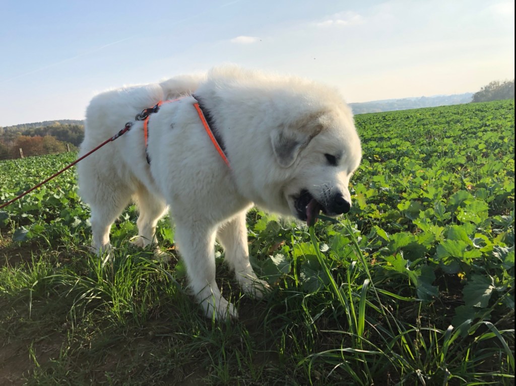 Dann sind wir am Rübenfeld vorbei und zum kleinen Feldweg. Dort habe ich erstmal Gras geknabbert. Frisches Gras. Das knabbere ich gerne. Ich bin aber kein Schaf! Ich bin eine Pyrenäenberghündin! Aber dann sind wir nach Hause gegangen. Über die Wiese auf der anderen Straßenseite.