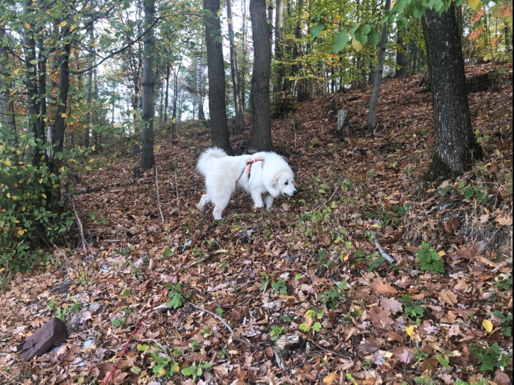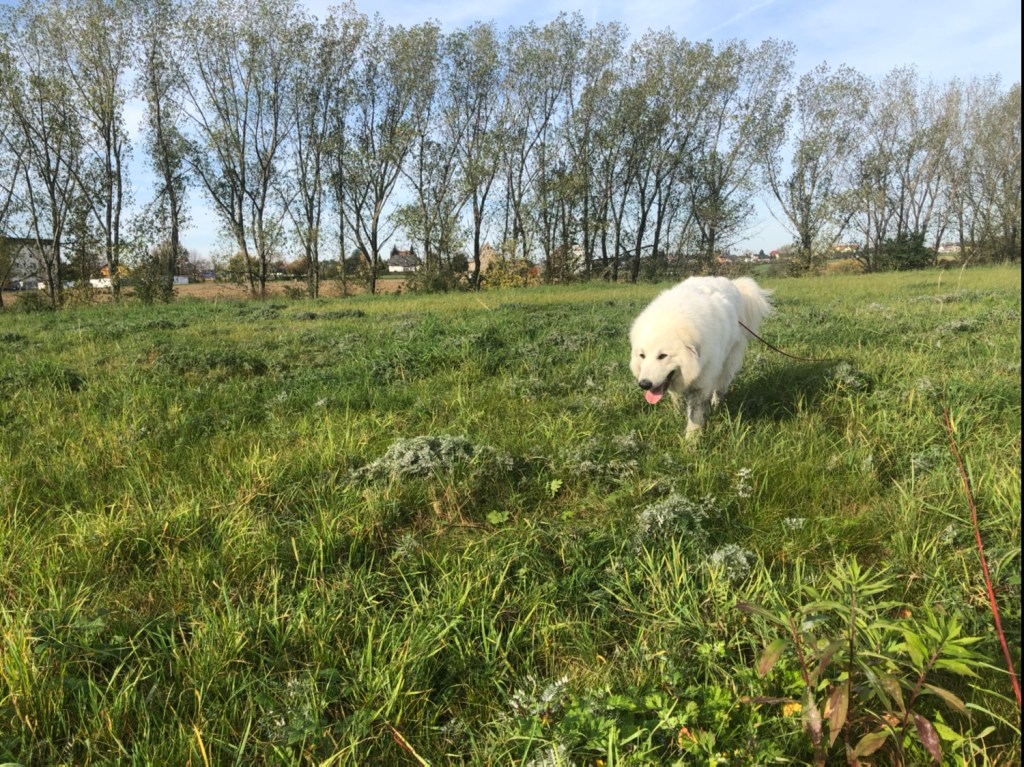 Dann sind wir wieder über eine schöne Wiese. Ich habe die ganze Zeit geschnuffelt und bin hin und her geflitzt. Das war sooo schön! Die schöne Wiese war dann aber zu Ende und da ging es nicht weiter, also sind wir ein Stück zurück und einen kleinen Hang runter auf eine große Wiese. Da lagen ganzganz viele frische Kuhhaufen. Von den Rindviehchern. Aber ich war ganz lieb und habe nicht genascht! Nichtmal geschnuffelt habe ich! Ich bin eine wohlerzogene Pyrenäenberghündin. Ich weiß, wie man sich benimmt. Jawoll!