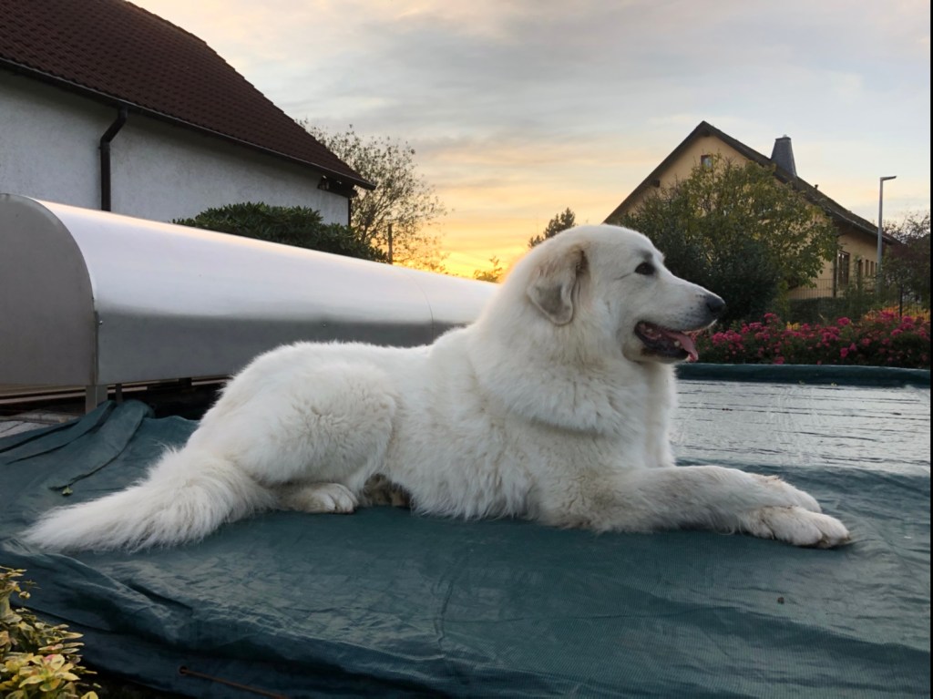 Nachmittags bin ich mit meinen großen Menschen in meinem Garten gewesen. Da haben wir wieder Gartenarbeit gemacht. Den ganzen langen Nachmittag. Meine große Menschin hat Erde verteilt und mein großer Mensch die Hecke an meinem Gartenzaun schön gemacht. Und ich habe aufgepaßt. Das ist meine Aufgabe. Ich bin eine Herdenschutzhündin!