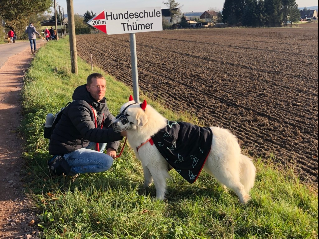 Und dann sind meine großen Menschen gekommen und wir sind mit meinem weißen französianischen Auto gefahren. Bis zu einem Parkplatz. Da waren noch andere Autos. Und ich habe gewartet. Und dann durfte ich aussteigen. Und da waren noch mehr Hunde. Die kannte ich. Von der Hundeschule. Und alle waren wir verkleidet. Die Emma war auch da. Und die Emma. Und die Sina. Und noch viel mehr. Erstmal gab es Gezicke. Das ist normal. Ich habe auch geschimpft. Bin ja eine große Hündin und muß für Ordnung sorgen. Und dann sind wir gewandert.