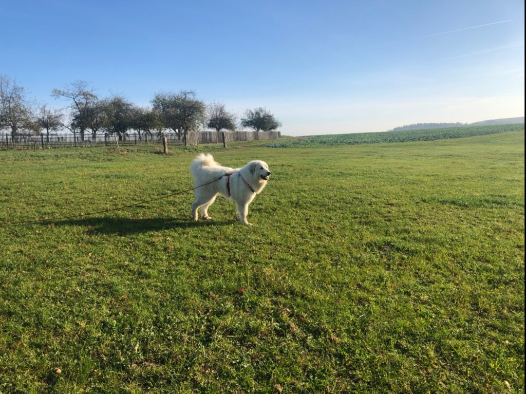 Das war eine ganz lange Wanderung. Zwei Stunden, sagt mein großer Mensch. Und noch dazu neun Kilometer. Das ist ganz schön viel. Ich war ein kleines Teufelchen. Obwohl ich eigentlich eine Pyrenäenbergprinzessin bin. Mein Name ist Annastasia Isabella Prinzessin Idefix vom Ehrenberger Hof, aber Bella genügt! Ich hatte sogar meinen schönen Nasenzaun an. Da sehe ich besonders gefährlich aus, hihihihiii. Das war eine ganz schöne Wanderung. Meine liebe Sonne war auch mit. Die ganze Zeit. Dann sind wir wieder am Parkplatz gewesen und ich bin in meinem weißen französianischen Auto mit meinen Menschen nach Hause gefahren.