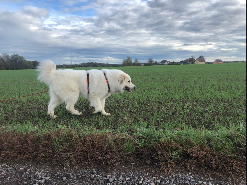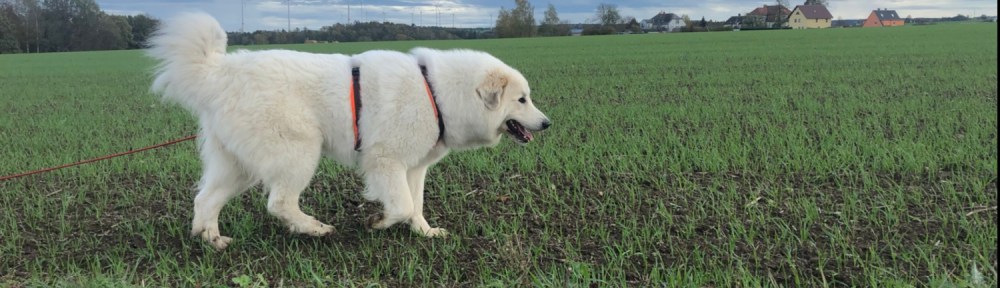 Wir sind wieder durch die alte Siedlung gelaufen. Und da wollte ich dann gleich noch weiter zu der Frau Dobermann. Aber mein großer Mensch nicht. Deshalb sind wir dann über die Wiese am Waldrand lang. Bis zu den Wochenendhäusern und da waren wieder die beiden Hunde, die mich angeschimpft haben. Aber mich stört das nicht. Ich bin ziemlich groß und stark. Und eine Pyrenäenberghündin bin ich, eine Herdenschutzhündin! Ich war ganz ruhig. Wir sind einfach weiter auf den Feldweg gewandert. Ich habe geschnuffelt.