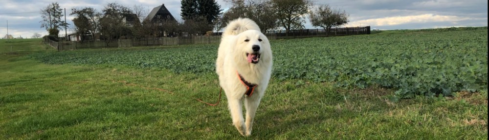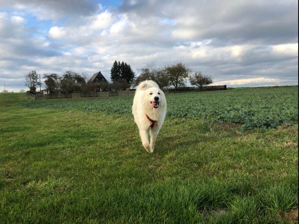 Und dann sind wir losgewandert. Zuerst zu meiner großen Feldwiese. Da habe ich wieder geschnuffelt und wir sind gerannt. Und dann sind wir am Feldrand lang und dann noch über die große Wiese. Und da sind wir wieder gerannt. Dann sind wir über den großen Feldweg am Rand vom Rübenfeld lang zur großen Straße. Da sind wir gleich drüber auf die andere Seite und ein Stück an der großen Straße zu dem kleinen Feldweg. Den sind wir dann zu den Wochenendhäusern gelaufen und da hat mich schon der Schäferhund begrüßt. Der ist lieb. Der grüßt freundlich. Der schimpft mich nicht an. Ich bin ja auch lieb.