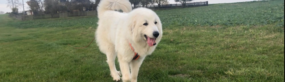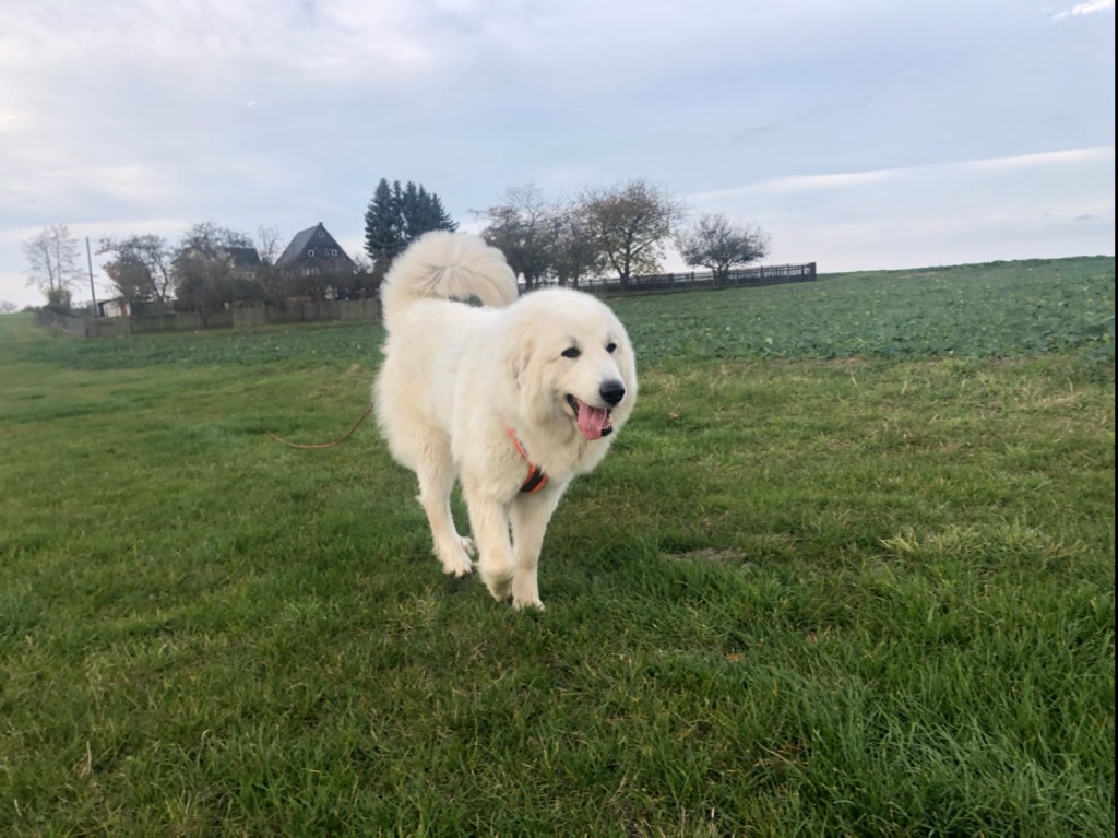 Wir sind dann über die Wiese am großen Fluß mit dem komischen Namen gegangen und da haben wir mindestens 6-8 Reiher gesehen. Die sind über dem Fluß geflogen. Ganz groß waren die. Dann sind wir wieder zurück zur großen Wiese und den Berg hoch. Unterwegs habe ich mit meinem großen Mensch gekuschelt. Wir sind dann auf dem großen Feldweg zurück zur Straße und auf der anderen Seite über die Wiese. Und da haben wir den Odin gesehen. Der kam auf der anderen Straßenseite entgegen und ist auch spazieren gegangen.