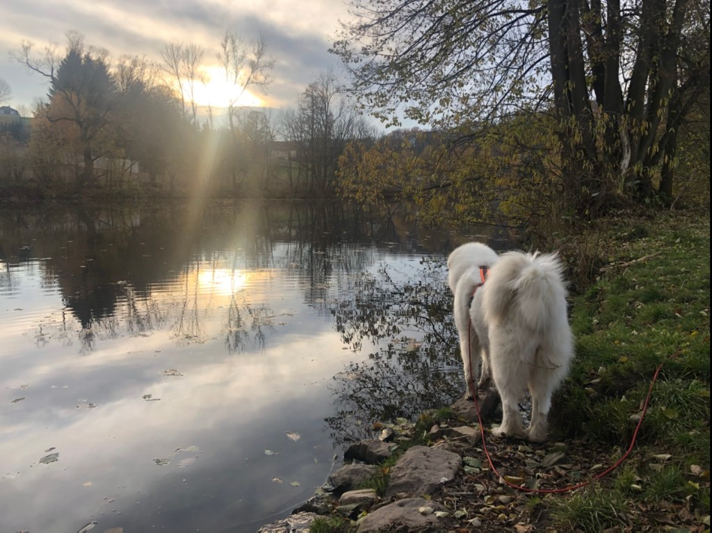 Nachmittags sind wir auch nochmal spazieren gewesen. Auf der großen Feldwiese. Und dann ging es die große Wiese den Berg runter, zum großen Fluß mit dem komischen Namen. Da ist die Bella geflitzt. Und mein großer Mensch hinterher. Ich bin aber nur so schnell geflitzt, daß mein großer Mensch auch hinterherkommt. Ich bin rücksichtsvoll. Dann war ich im großen Fluß trinken. Nur mit meinen vorderen Pyripfötchen war ich drin. Das genügt.