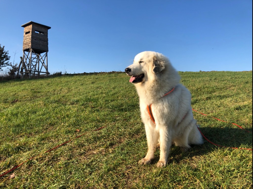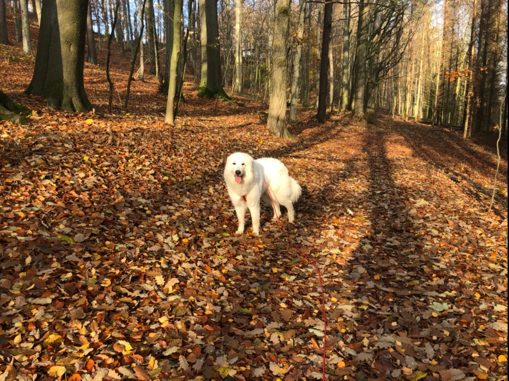 Über die Wiese gehen wir dann in den Wald und weiter Richtung „Waldhaus“. Überall liegt buntes Raschellaub. Die Bella mag buntes Raschellaub. Das raschelt so schön, wenn ich spazieren gehe. Wir sind zusammen durch den ganzen Wald gelaufen und dann den Berg hoch zu den riesigen Wiesen. Dort konnte ich wieder schön schnuffeln.