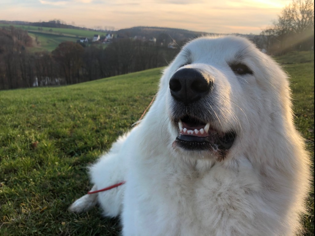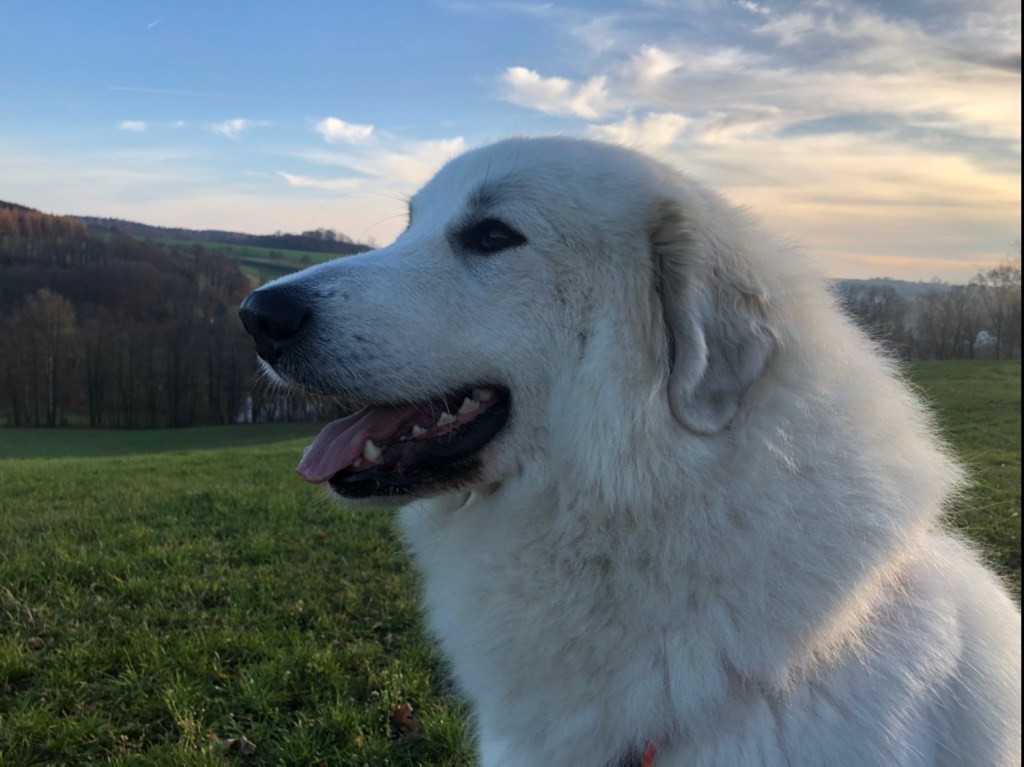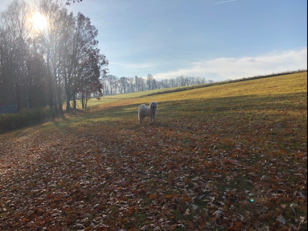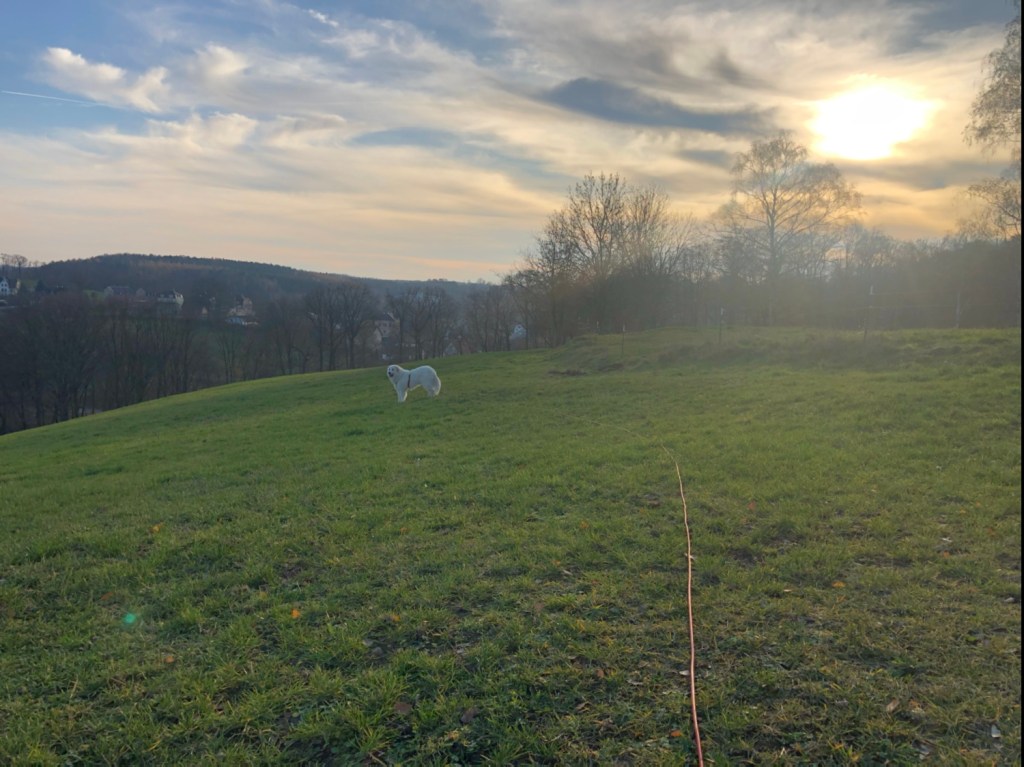 Vom „Waldhaus“ sind wir dann wieder zurück in den Wald und dann den Berg hoch auf die riesengroßen Wiesen. Da kann die Bella schön in alle Richtungen gucken und schnuffeln und flitzen. Heute haben wir aber keine Reiher gesehen. Wir sind wieder mit meiner lieben Sonne quer über die ganze Wiese gebummelt. Und dann weiter Richtung Skihang. Unterwegs haben wir einen Mensch mit Hündin getroffen. Auch ein Mädchen, wie ich. Ich bin ganz lieb gewesen und habe mich vor meinen großen Mensch gesetzt. Das macht man so als Herdenschutzhündin. Immer seine Menschen abschirmen. Das andere Mädchen war auch ganz lieb. Keine Gefahr! Dann sind wir zum Skihang gelaufen. Da habe ich mich nochmal ausgeruht und mit meinem großen Mensch Picknick gemacht.