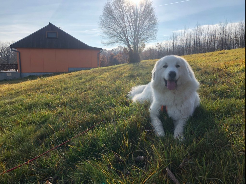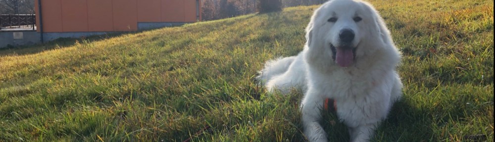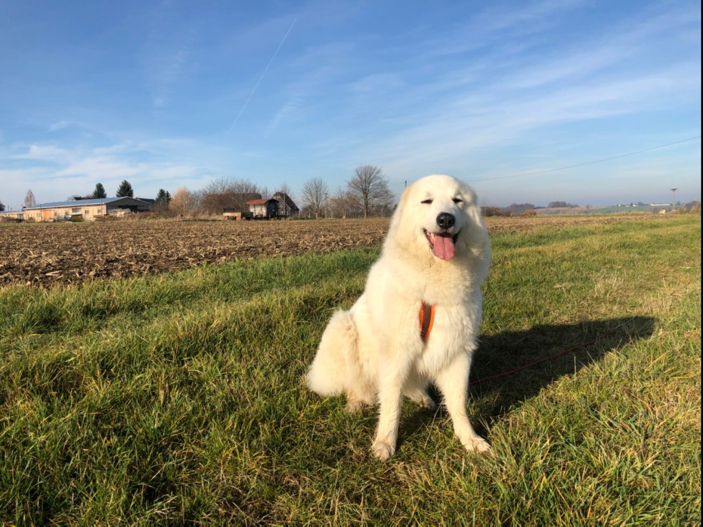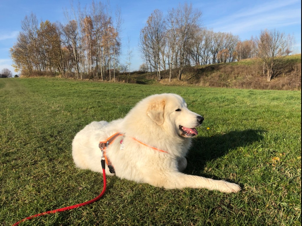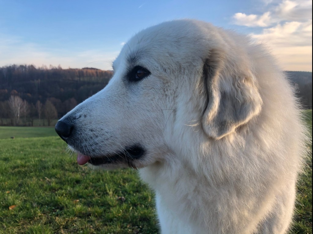 Vom „Waldhaus“ sind wir dann wieder zurück in den Wald und dann den Berg hoch auf die riesengroßen Wiesen. Da kann die Bella schön in alle Richtungen gucken und schnuffeln und flitzen. Heute haben wir aber keine Reiher gesehen. Wir sind wieder mit meiner lieben Sonne quer über die ganze Wiese gebummelt. Und dann weiter Richtung Skihang. Unterwegs haben wir einen Mensch mit Hündin getroffen. Auch ein Mädchen, wie ich. Ich bin ganz lieb gewesen und habe mich vor meinen großen Mensch gesetzt. Das macht man so als Herdenschutzhündin. Immer seine Menschen abschirmen. Das andere Mädchen war auch ganz lieb. Keine Gefahr! Dann sind wir zum Skihang gelaufen. Da habe ich mich nochmal ausgeruht und mit meinem großen Mensch Picknick gemacht.