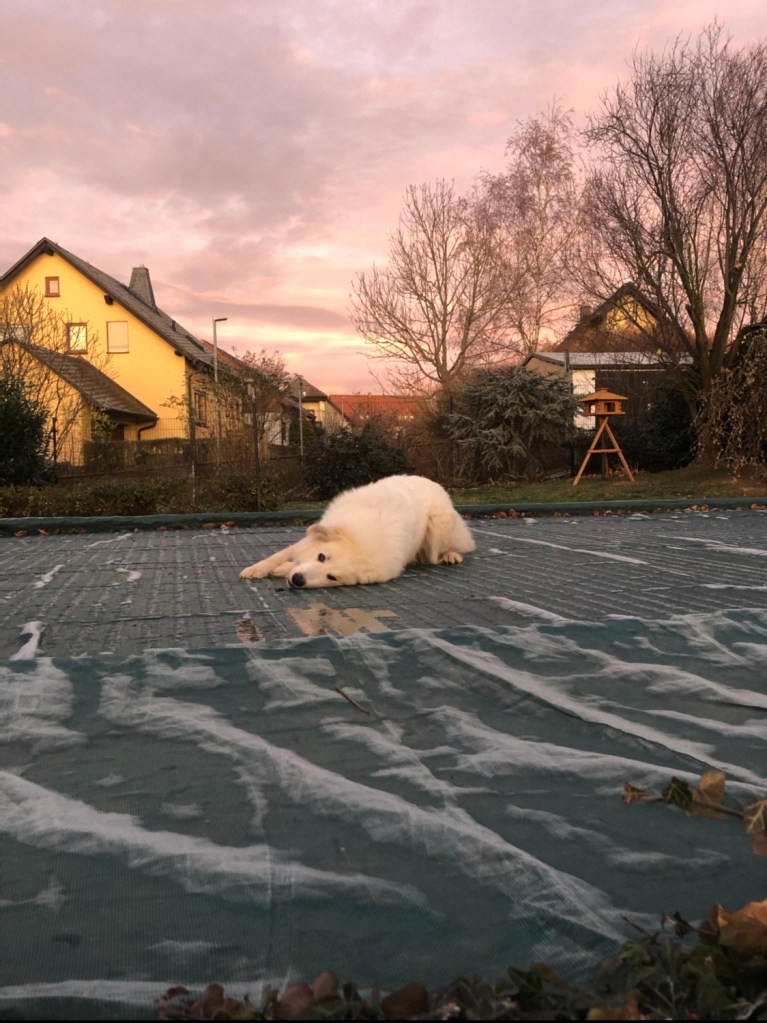 Dann habe ich den ganzen Tag meinen Garten bewacht. Das kann ich gut. Mein Menschenopi war auch bei mir in meinem Garten. Und die Vögelchen haben am neuen Futterhaus gefuttert. Und nachmittags habe ich ein Lied gesungen. Wie eine echte weiße Wölfin! Mit Schlappohren! Und mit der Sirene zusammen. Ich kann schön singen!