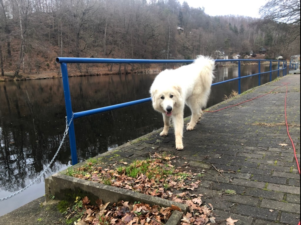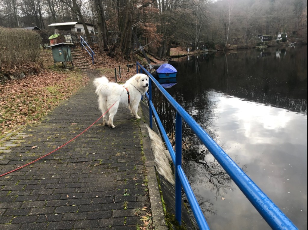 Die Runde wurde immer größer. Ich bin dann weiter zum großen Fluß mit dem komischen Namen gegangen. Da mußte mein großer Mensch natürlich auch mit. Weiter sind wir dann zur Wiese an der Fuchsfarm und über die sind wir quer drüber. Bis zum Wald. Am Skihang sind wir dann vorbei und durch den Wald in mein Wohngebiet.