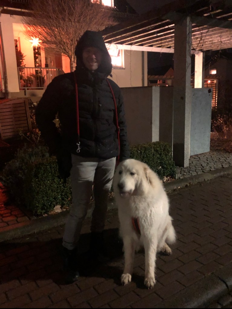 Nachmittags sind meine großen Menschen nochmal weg und erst abends wieder nach Hause gekommen. Da sind sie gleich mit mir abendspazierengegangen. Alle beide! Großer Mensch und große Menschin! Durch mein Wohngebiet. Da konnte ich zeigen, wie lieb ich bin.