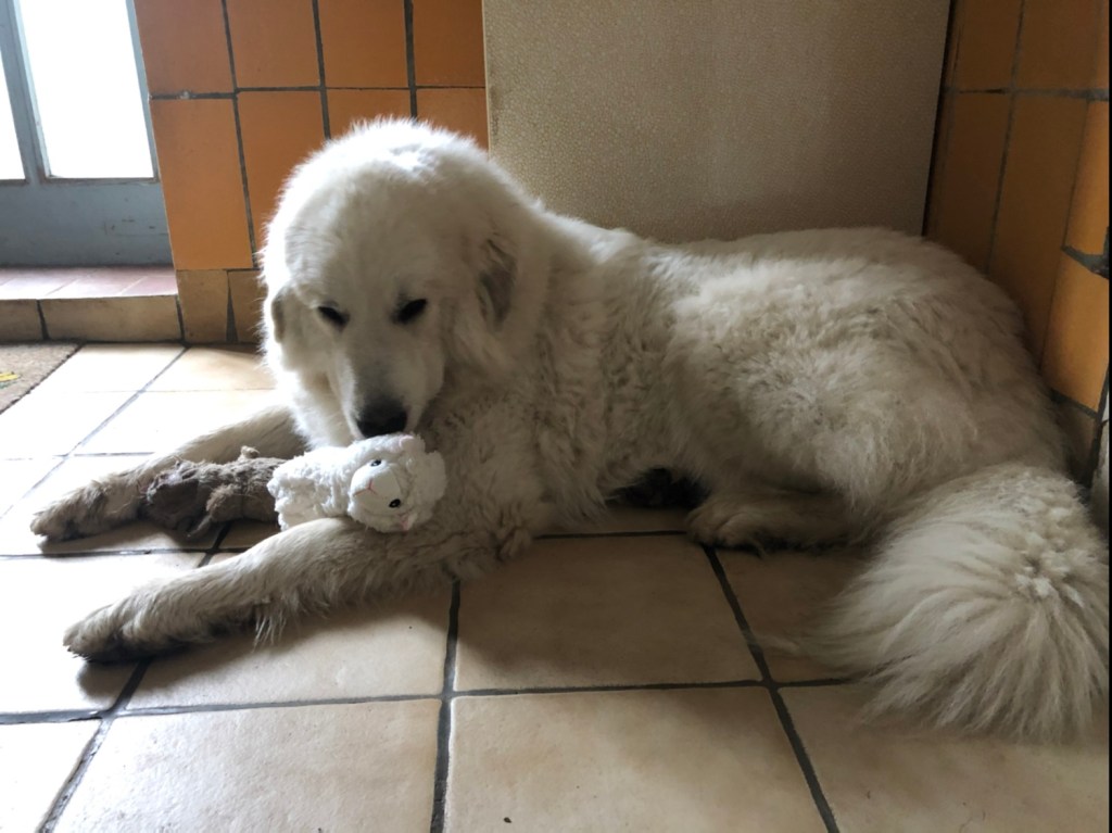 Ich mußte aber noch warten. Dann ist mein großer Mensch gekommen und wir sind losspaziert. Wir sind durch mein Wohngebiet gewandert. Es hat geregnet. Nicht sehr, aber es hat geregnet. Schon den ganzen Abend. Deshalb war ich auch untrocken. Also, mein wunderschönes champagnercremeweißfarbenes Pyrifell war untrocken. Auch nach dem Spaziergang durch mein Wohngebiet. Wir sind dann gleich in meine Kellerwohnung gegangen. Mein großer Mensch hat noch mein Pyrifell und meine Pyritatzen trockengerubbelt. Und dann hat er noch meine Kellerwohnung sauber gemacht. Damit ich es schön habe. Ich bin mit meinen Kuscheltieren, meinem Schäfchen und meinem neuen Kuschellama. In mein kleines rotes Ferienhäuschen gekrabbelt und habe es mir da gemütlich gemacht. Dann habe ich schön geschlummert. Ganz schnell. Gute Nacht! 🐶👸🏼