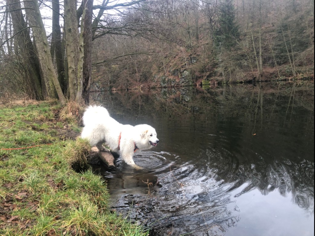 Dann sind wir den Wanderweg am großen Fluß zurück gegangen. Und da sind dann die Jogger gerannt gekommen. Die haben wir erstmal vorbei gelassen. Und ich bin dann mit meinem großen Mensch über die Wiese an den großen Fluß mit dem komischen Namen gegangen. Da habe ich getrunken.