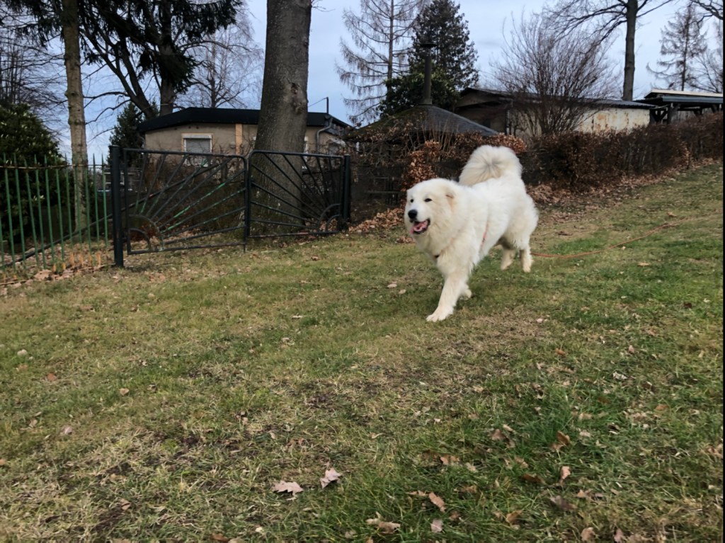 Heute ist mein großer Mensch nicht ganz so zeitig zu seiner Arbeit. Aber trotzdem noch zeitig. Ich habe noch geschlummert und bin erst später in meinen Garten zu meiner Arbeit. Ich passe nämlich auf alles auf. Ich bin eine Herdenschutzhündin!