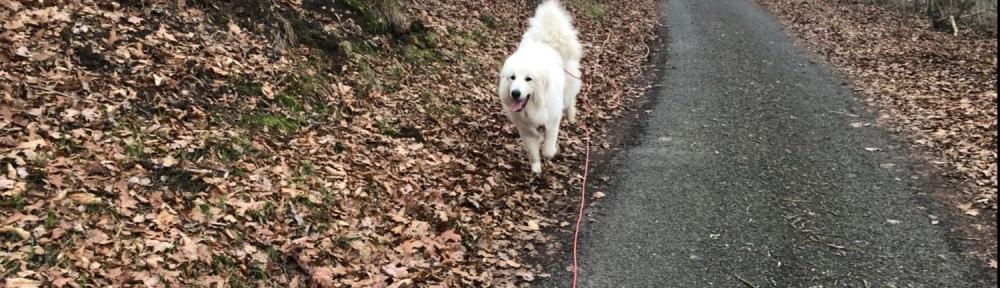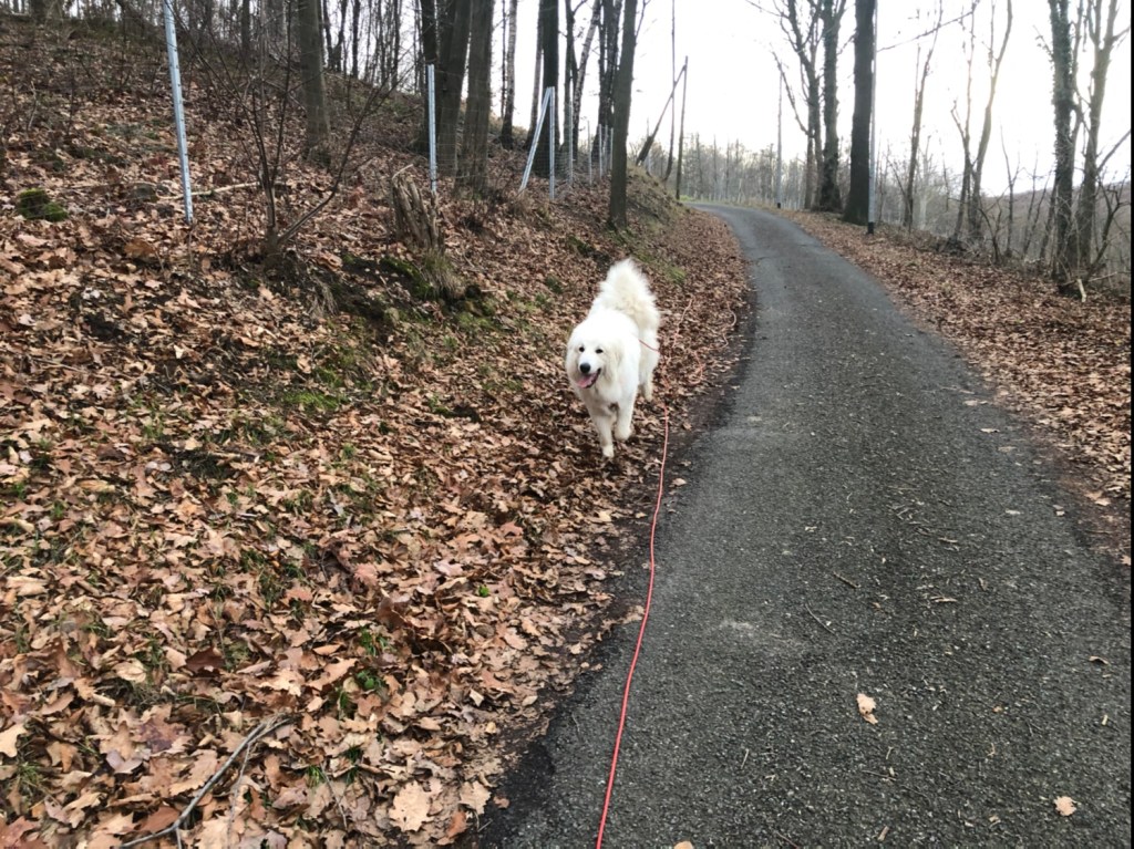 Die Frau Dobermann hat uns ganz laut begrüßt. Wir sind aber weiter gegangen. Bis zum kleinen Parkplatz und da bin ich gleich drüber gelaufen, weiiil, ich kenne den Weg. Wir sind über die große Wiese zum Wald gegangen und da bin ich ganz schnell in den Wald abgebogen. Da muß ich schnell sein, bevor sich mein großer Mensch einen anderen Weg ausdenkt. Ich bin eine Pyrenäenberghündin, ich weiß selber, was ich will. Und ich habe ein. Ganz hübsches Köpfchen. Das kann ganz stur sein. Im Wald bin ich dann gleich abgebogen. Da war nämlich ein Weg, den wir noch gar niemals nie gegangen sind. Ich bin immer vorneweg gelaufen. Und mein großer Mensch hinterher. Und da sind wir dann am Feldrand beim kleinen Wäldchen rausgekommen.
