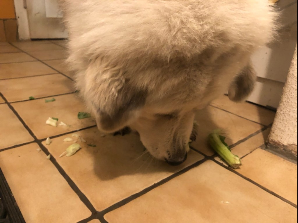 Zum Abendfuttern bin ich wieder in meine Kellerwohnung gegangen. Mit meinen großen Menschen. Meine große Menschin hat mir Blätter vom Blumenkohl gegeben. Die habe ich zerlegt und dann die Stiele geknabbert. Das macht Spaß. Dann habe ich mein Abendfutter geabendfuttert. Danach bin ich gleich wieder in meinen Garten und habe erstmal wieder jemanden wegschimpfen müssen.