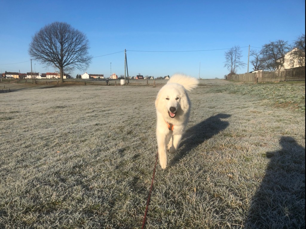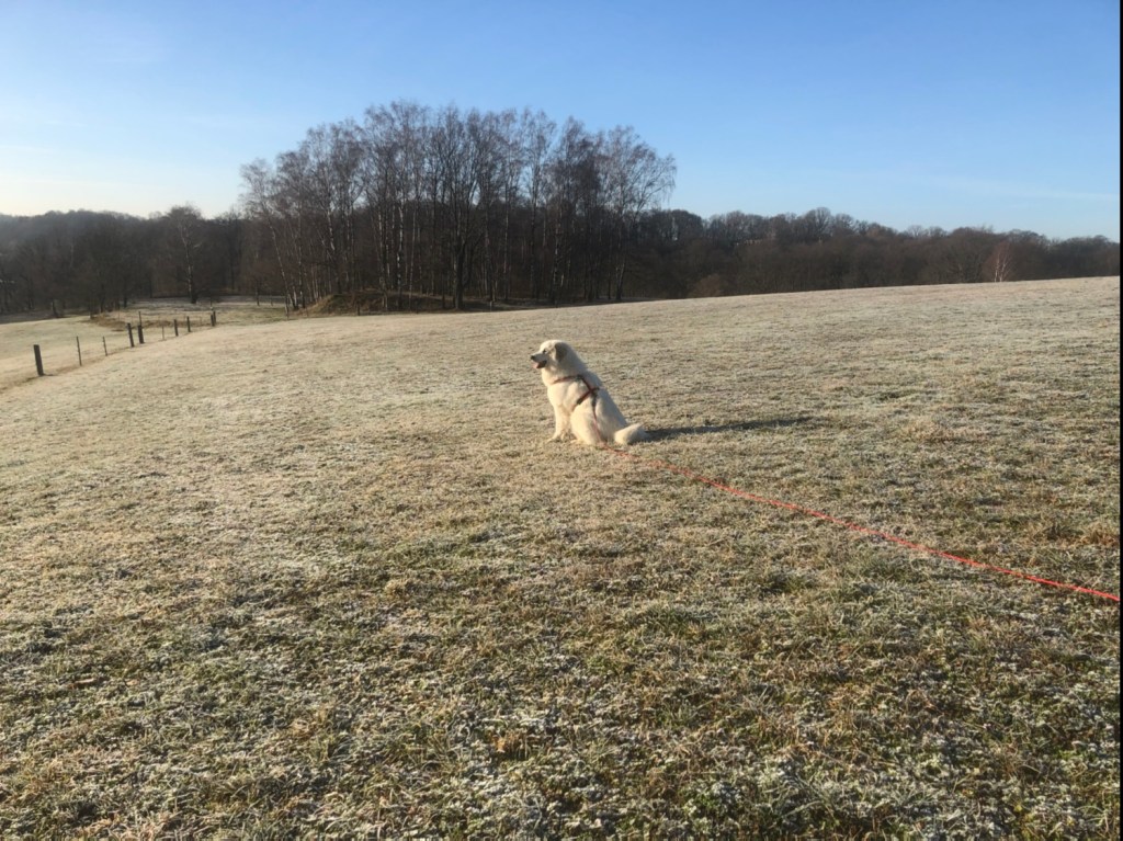 Erst bin ich noch in meinem Garten gewesen und dann ist mein großer Mensch gekommen und wir haben einen Spaziergang gemacht. Zu meiner großen Feldwiese. Und da war alles ganz weiß überfrostet. Das sah schön aus. Wir sind dann über meine große Feldwiese zu der Wiese am Wald gegangen und da habe ich die Rehe gesehen. Sieben Stück! Mein großer Mensch hat mich aber beruhigt und zurückgerufen. Ich war schon ein bißchen aufgeregt.