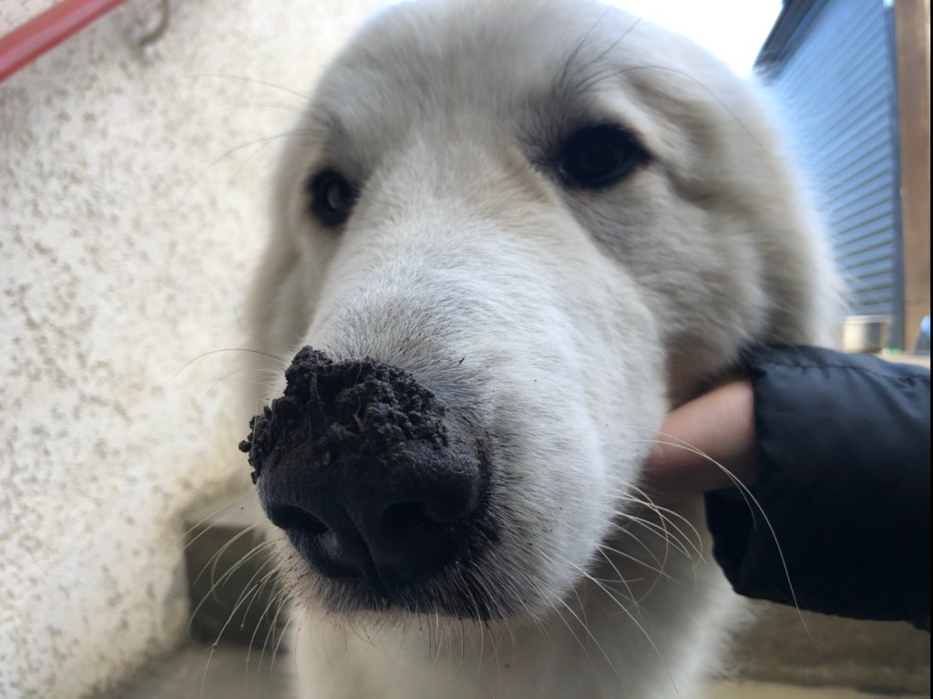 Mittags habe ich Gartenarbeit gemacht. Da habe ich gebuddelt. Buddeln kann ich nämlich auch gut! Das kann jeder Pyrenäenberghund. Ich bin aber eine Pyrenäenberghündin! Da war dann Erde auf meiner schwarzen Pyrenäenberghundeprinzessinnennase. Das sieht gar nicht mal schlecht aus.