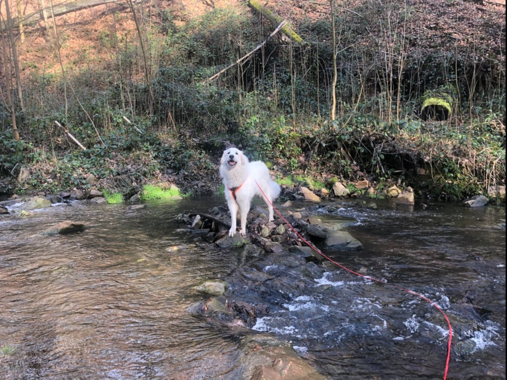 Meinen Sonntagsspaziergang habe ich heute mit meinem großen Mensch und meiner großen Menschenschwester gemacht. Wir sind durch den Stadtpark gewandert. Im Stadtpark sind alle Wege schon ganz fein sauber gemacht. Alles Herbstlaub ist weggeräumt worden und es sieht auf allen Wanderwegen überall hier im Wald ganz ordentlich aufgeräumt aus. Da ist jemand ganzganzganz fleißig gewesen. Bestimmt extra für die Bella. Unterwegs haben wir zuerst drei Hunde getroffen. Einer hat mich angeschimpft, da habe ich zurückgeschimpft und ein Hundemädchen war ganz neugierig und hat mich immer angeschnuffelt. Die war abgeleint aber ganz niedlich. Und dann haben wir noch ein Eichhörnchen getroffen. Mit dem wollte ich spielen, aber da ist es auf einen Baum geklettert. Das kann ich nicht, ich kann nur auf Felsen klettern. Auf dem Heimweg sind wir noch bei Spike, dem Husky, gewesen. Der hat sich wieder ganz sehr gefreut. Und baden bin ich gewesen. Im Gottesaubach.