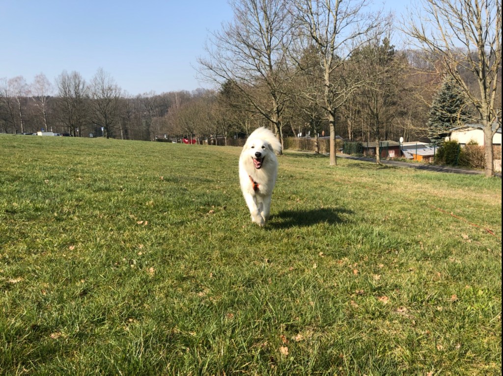 Zu Hause hat meine liebe Sonne auch schon lange in meinem Garten auf mich gewartet und da mußten wir dann einen Spaziergang machen. Meine große Menschenschwester ist auch mitgewandert. Und zuerst haben wir die Frau Nachbarin abgeholt. Wir sind dann durch die Siedlung bis zur Frau Dobermann gewandert. Die hat uns mit einer Rede begrüßt. Wir sind dann noch ein Stück in den Wald und über die Wiese zum Parkplatz. Die Menschen laufen jetzt immer in großem Abstand voneinander. Das ist wegen dem doofen Virus. Damit das nicht durch die Gegend hüpfen kann. Oder so. „Hundebegegnung ohne Kontaktaufnahme“, nur mit Menschen. Die Bella kennt das. Aus ihrer Hundeschule. Da üben wir sowas.
