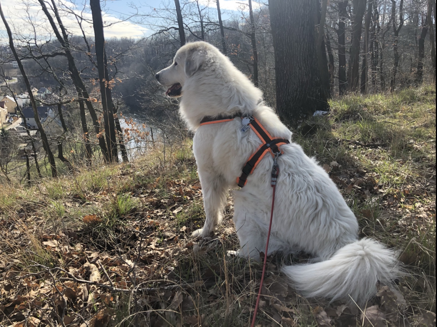 Auf der Rehwiese bin ich dann mit meinem großen Mensch gerannt. Ich bin viel schneller als meine Menschen. Aber ich laufe nicht einfach fort. Ich muß auf meine Menschen aufpassen, ich bin eine Herdenschutzhündin. Da muß ich immer in der Nähe von meinen Menschen sein. Wir sind dann zusammen zum Waldrand gegangen und runter von der Rehwiese in den Wald und da habe ich dann runter zum großen Fluß geguckt. Das war ganz spannend.