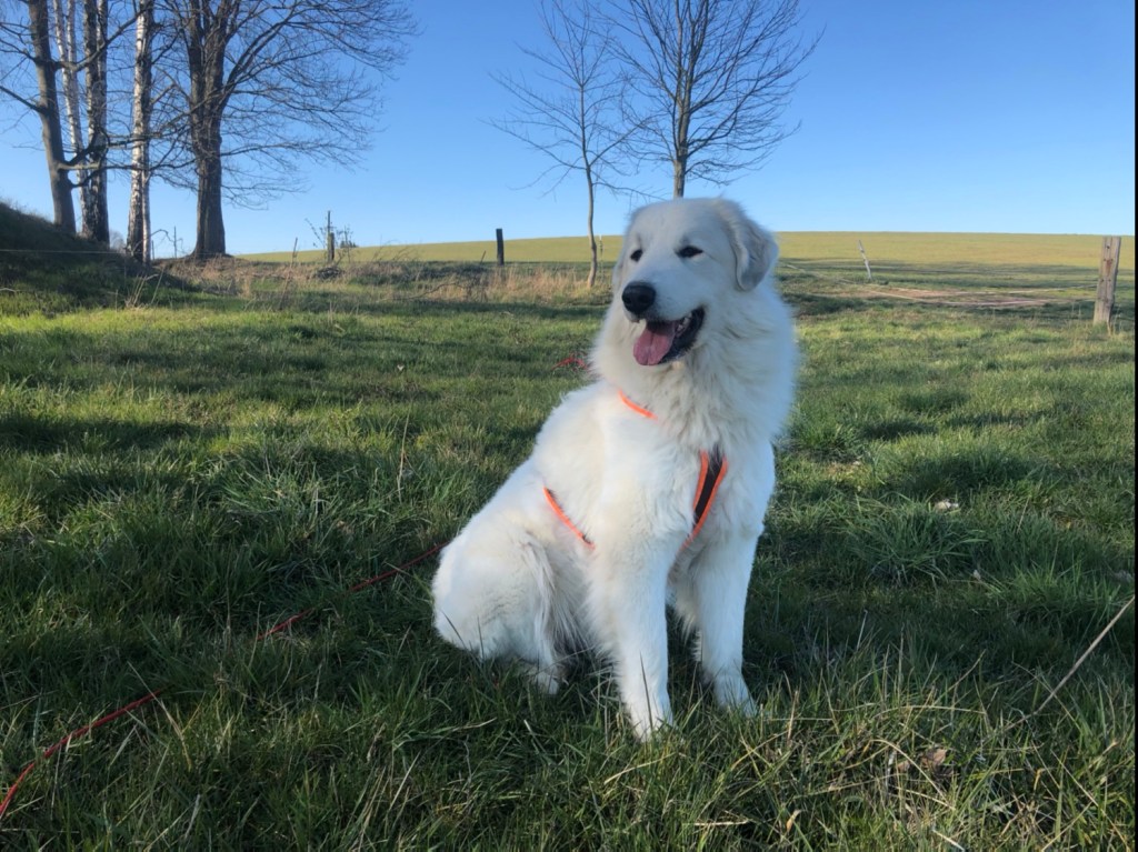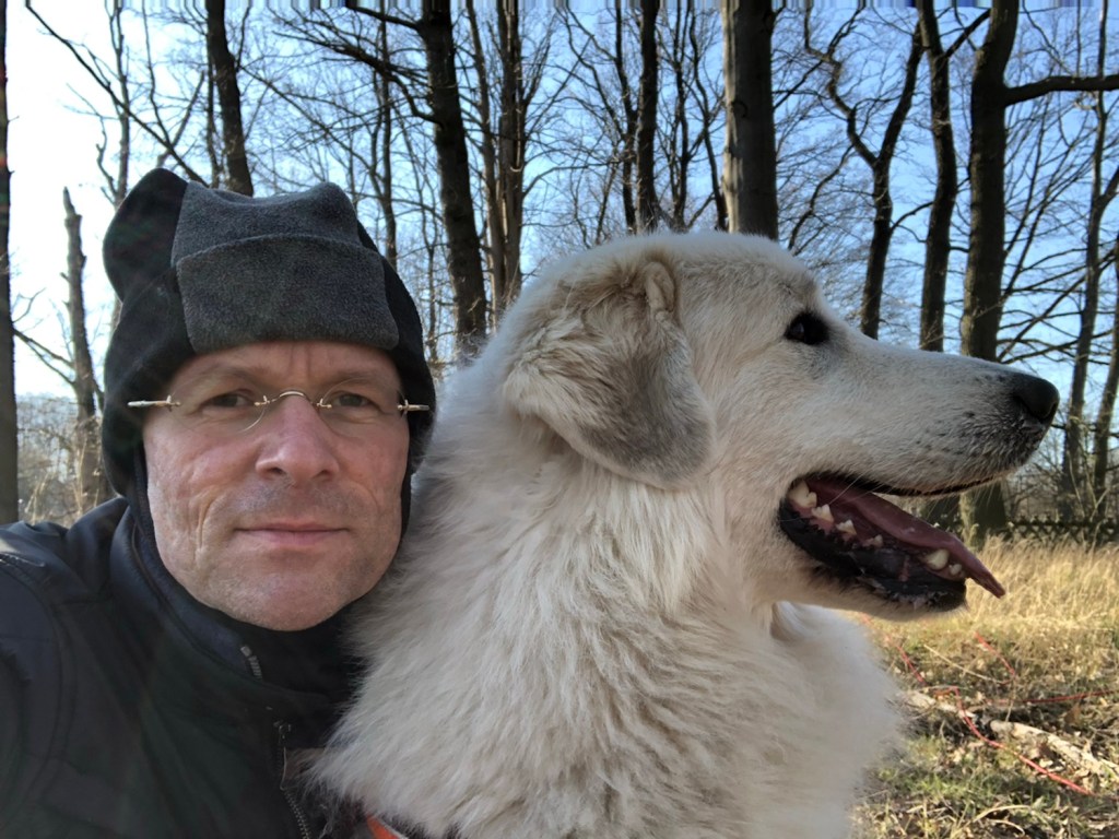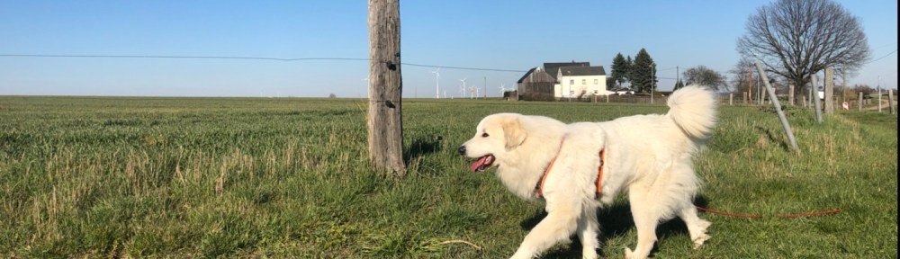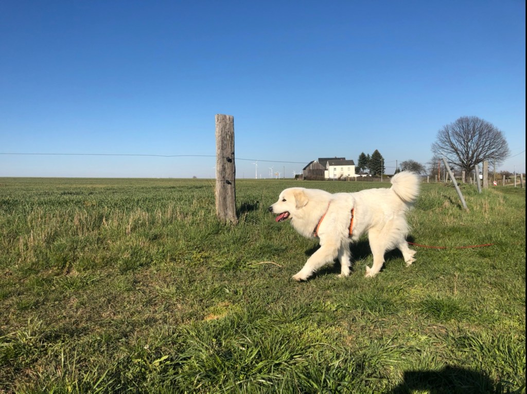 Nachmittags bin ich mit meinem großen Mensch spazieren gegangen. Wir sind auf meiner großen Feldwiese gewesen. Da habe ich wieder geschnuffelt und dann bin ich geflitzt. Mit meinem großen Mensch zusammen. Der ist aber nicht so schnell wie ich. Da muß ich Rücksicht nehmen. Ich bin ja eine liebe Pyri. Und danach sind wir gleich noch zur Rehwiese am Waldrand gegangen. Da waren aber keine Rehe. Wir haben dann noch vom Wald aus zum großen Fluß mit dem komischen Namen geguckt und haben uns dann wieder auf den Heimweg gemacht.