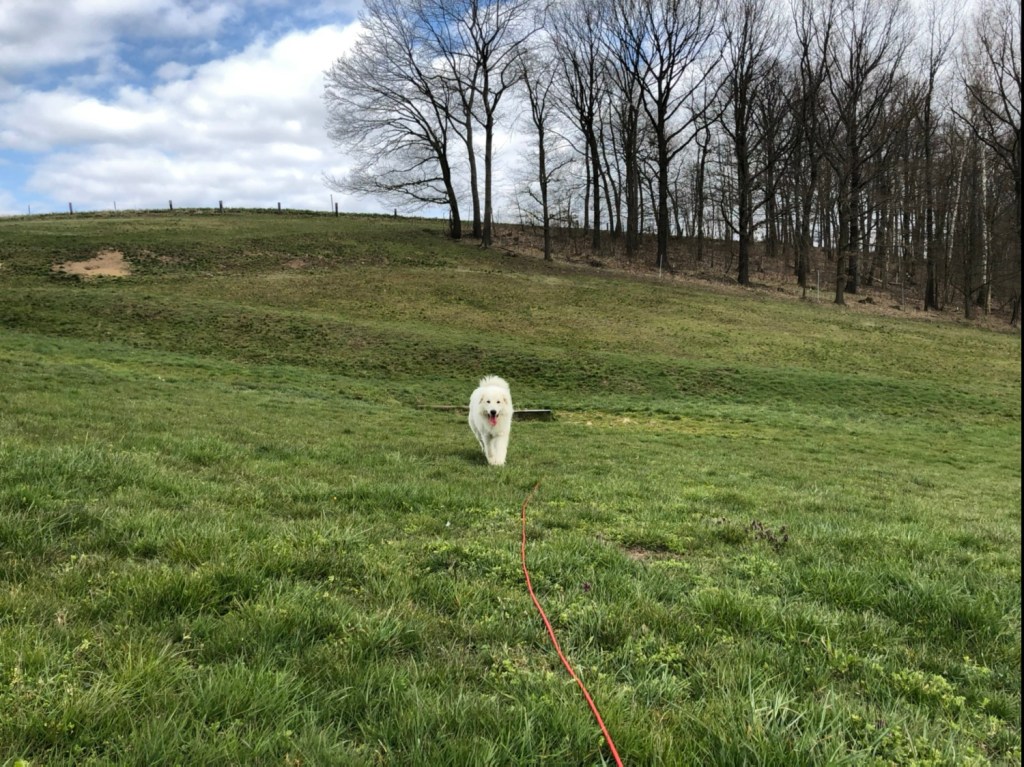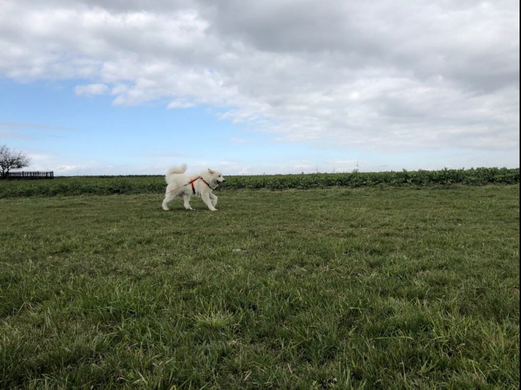Nachmittags bin ich dann mit meinem großen Mensch spazieren gegangen. Nur eine kleine Runde. Zu meiner Feldwiese. Da bin ich wieder geflitzt und habe geschnuffelt. Ich wollte weiter über die große Wiese den Berg runter an den großen Fluß mit dem komischen Namen. Aber mein großer Mensch wollte dann gleich zur Rehwiese am Waldrand. Und man muß immer lieb sein zu seinen Menschen. Ich bin eine ganz liebe Pyri und ich habe meine Menschen auch ganz sehr lieb. Ihr wißt ja, ich habe diese schönen ganz dunklen Pyriaugen, mit denen ich ja so gut gucken kann.