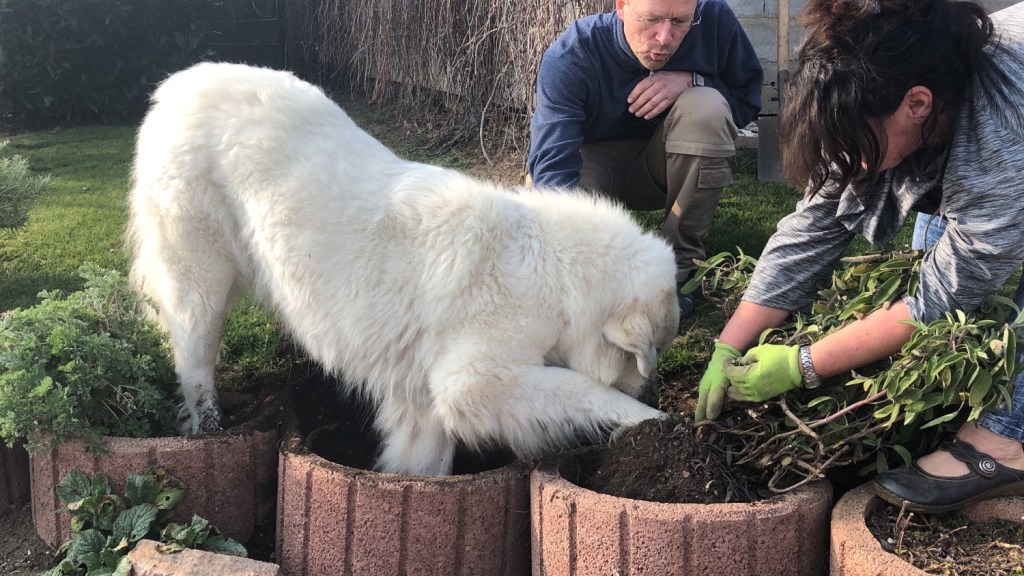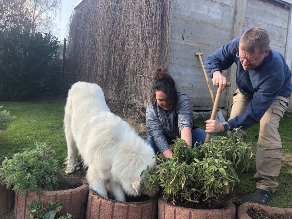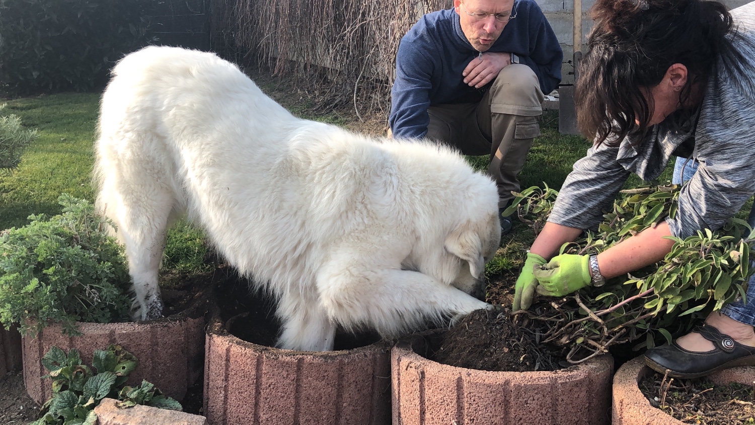 Nachmittags sind alle meine Menschen bei mir in meinem Garten gewesen. Zuerst hat meine große Menschin Gartenarbeit gemacht. Und mein großer Mensch hat dann meine Gartenwiese belüftet – verkuttitiert oder so. Ich weiß das nicht so genau. Ich bin noch klein. Und eine Pyri. Meine Menschenschwestern sind dann auch in den Garten gekommen und die haben Ball gespielt. Da habe ich zugeguckt. Meine großen Menschen haben dann im Kräutergarten die Pflanzringe neu gesetzt. Da habe ich auch zugeguckt. Und dann habe ich geholfen. Das kann ich nämlich. Helfen! Jawoll! Die Bella hat ganz schnell die Erde aus dem Pflanzring rausgebuddelt. Ich bin da viel schneller als meine Menschen. Ich bin eine Pyri! Danach habe ich mich aber wieder ausgeruht.